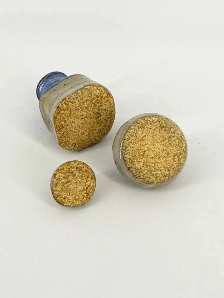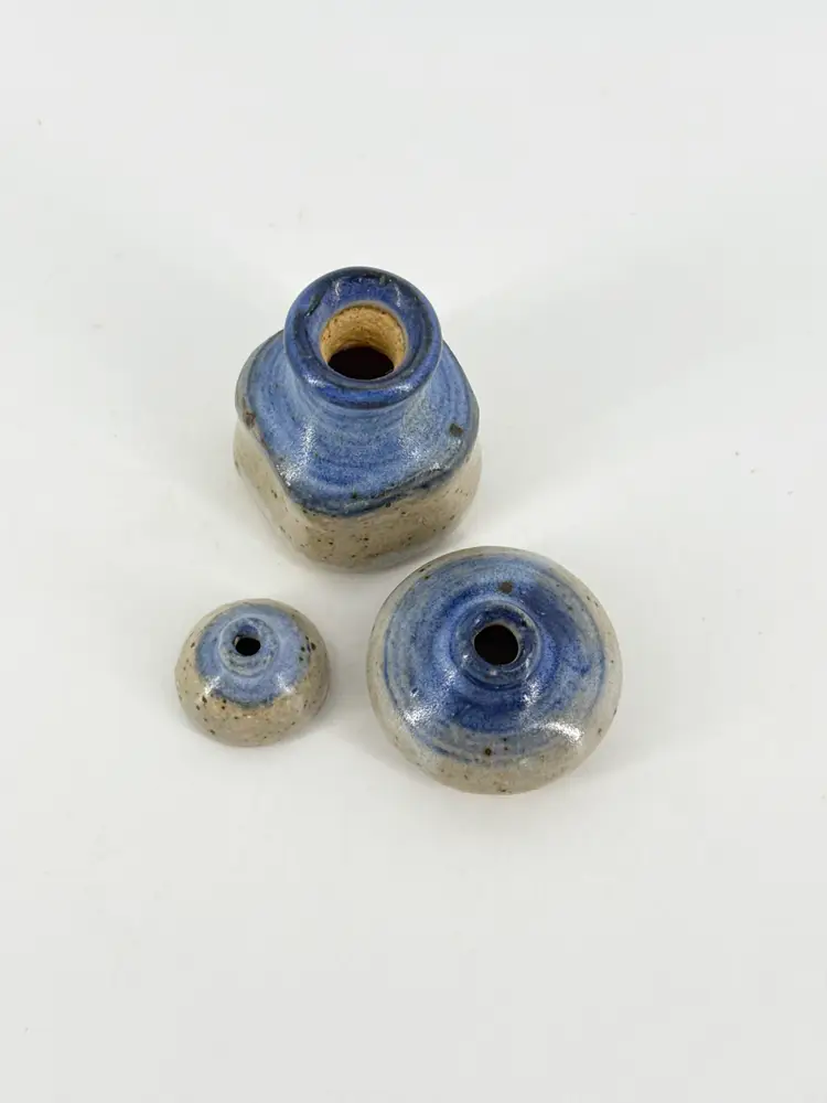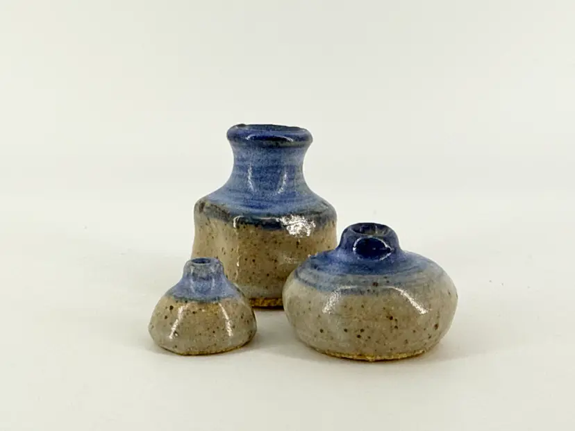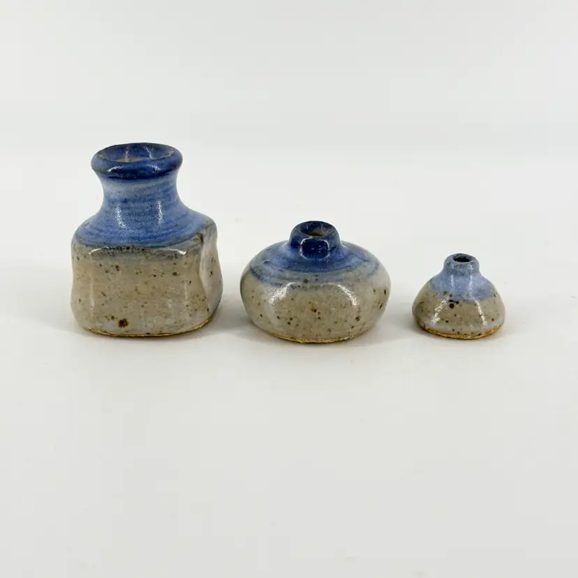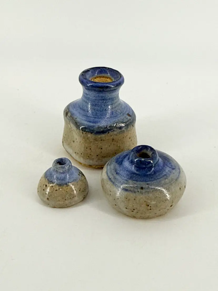 The taller one is 1.5" tall and measures 1.5"x1.5". The middle one is 1" tall and measures 1.5" in diameter at its widest. The smallest one is 0.5" tall and measures 1" in diameter at its widest. They are in excellent condition. There are no cracks, breaks, chips or repairs. (See photos).