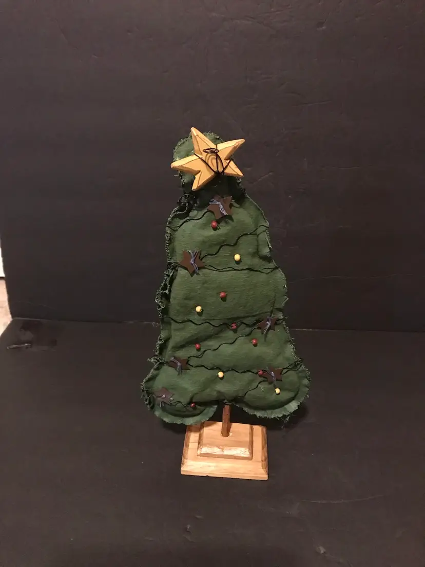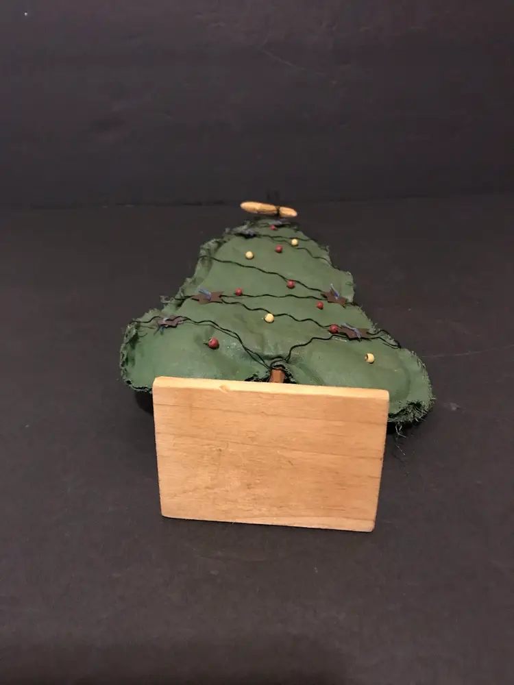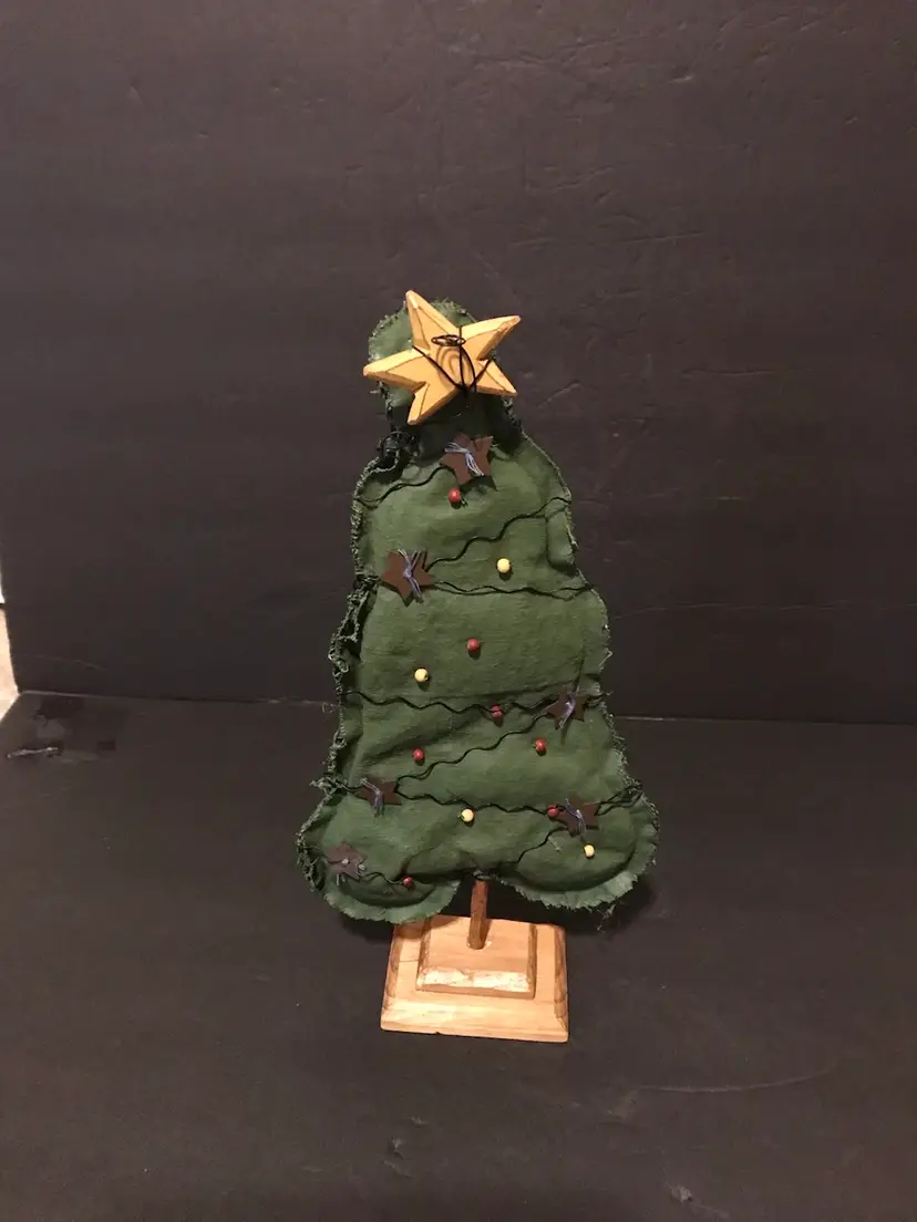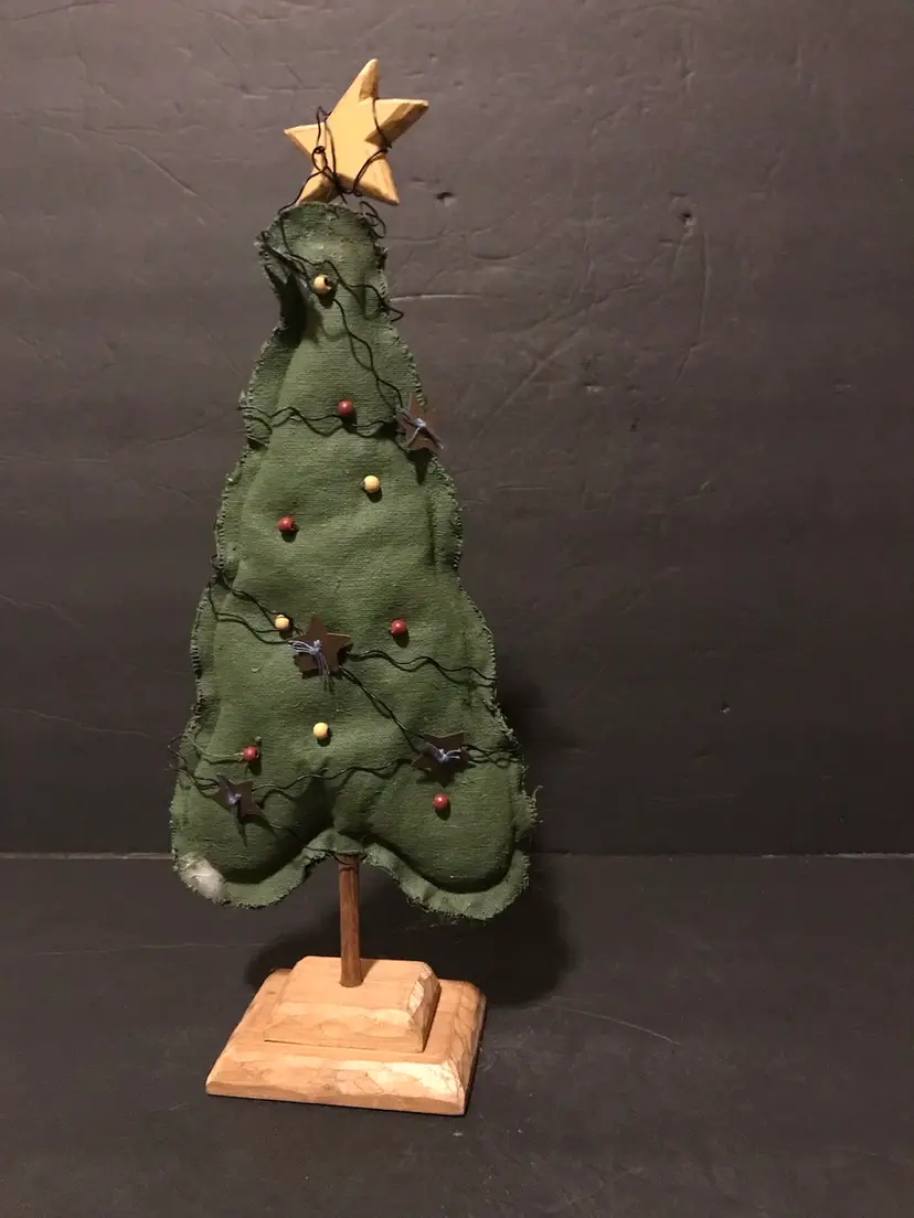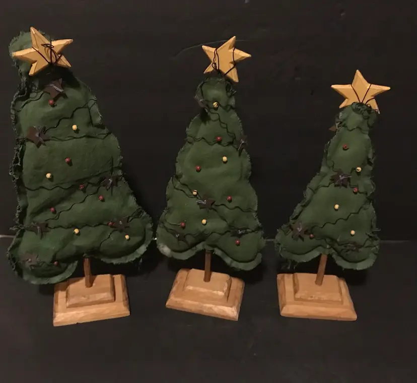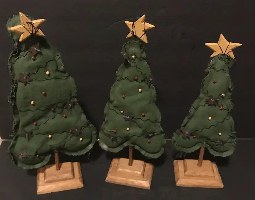 This product is a unique Christmas trees made from primitive folk art fabric in red and green colors. Handmade in the United States, it features a trio of fabric trees in sizes of 13, 11, and 9 inches. The trees are crafted from fabric and adorned with baubles of wood and wire on a wooden base perfect for a rustic and charming touch to your holiday decor. Each unit is made with care and attention to detail, making it a special addition to your seasonal decorations.