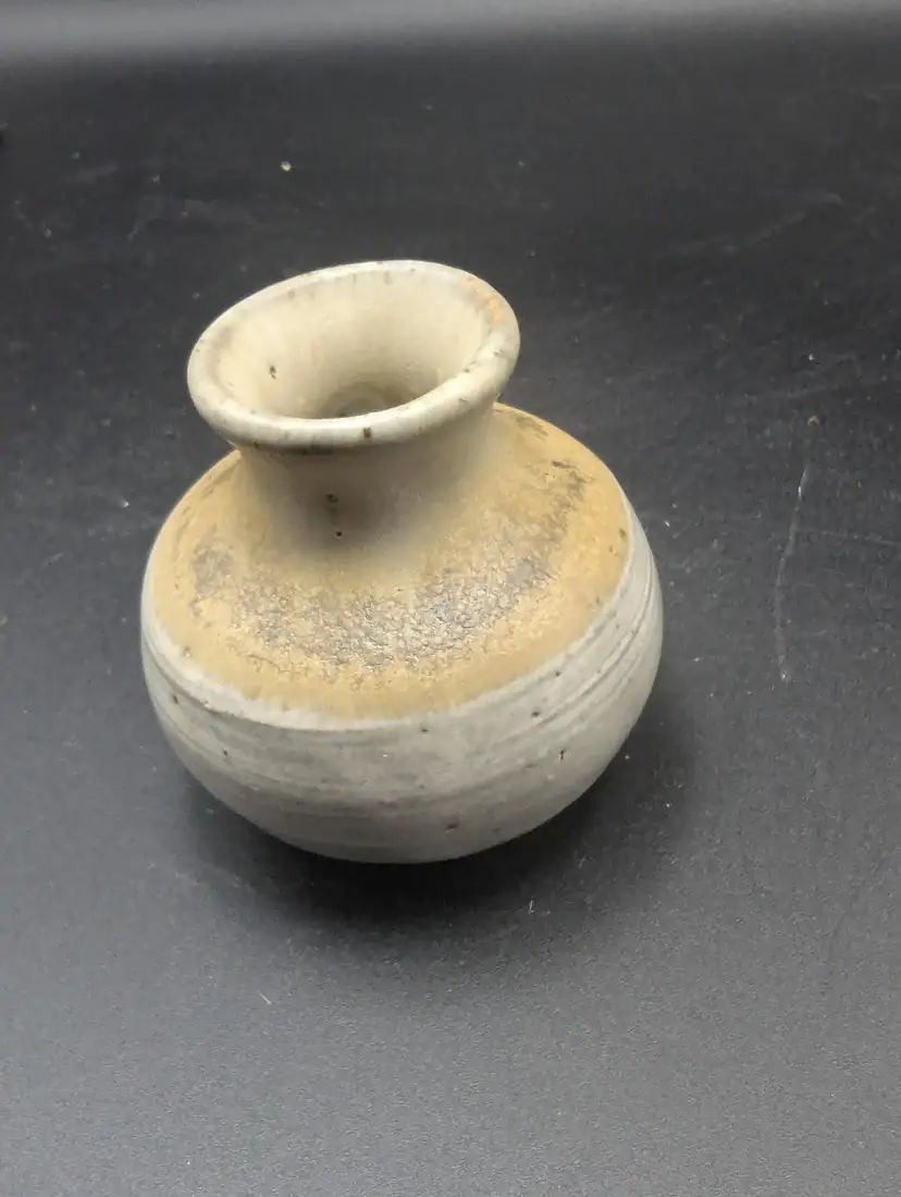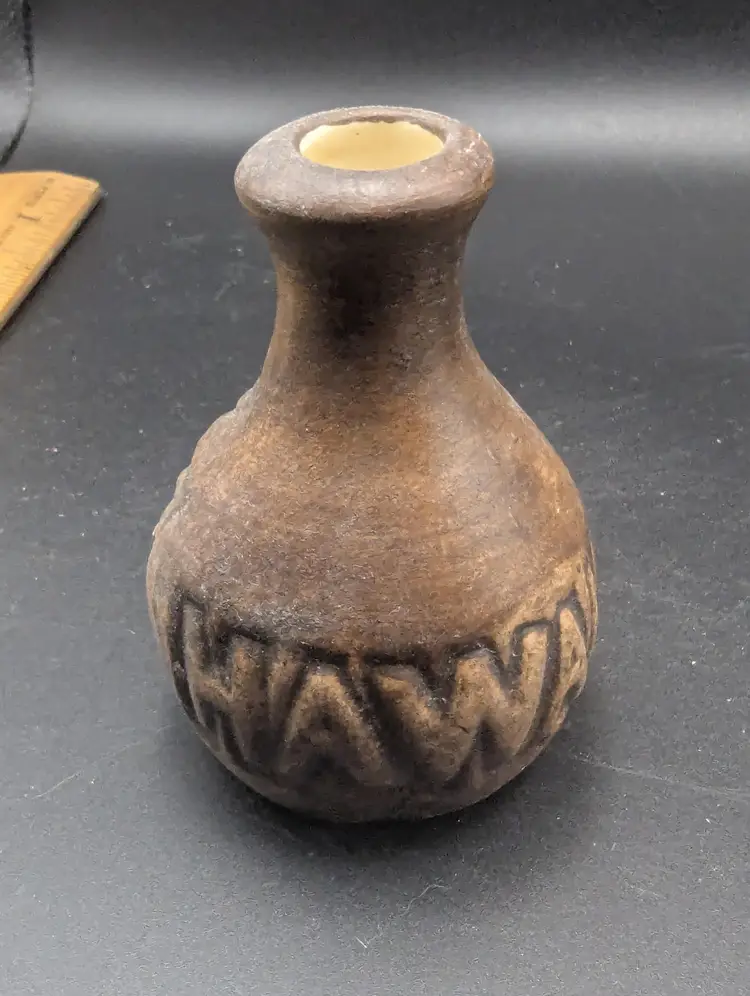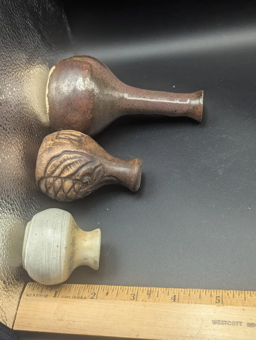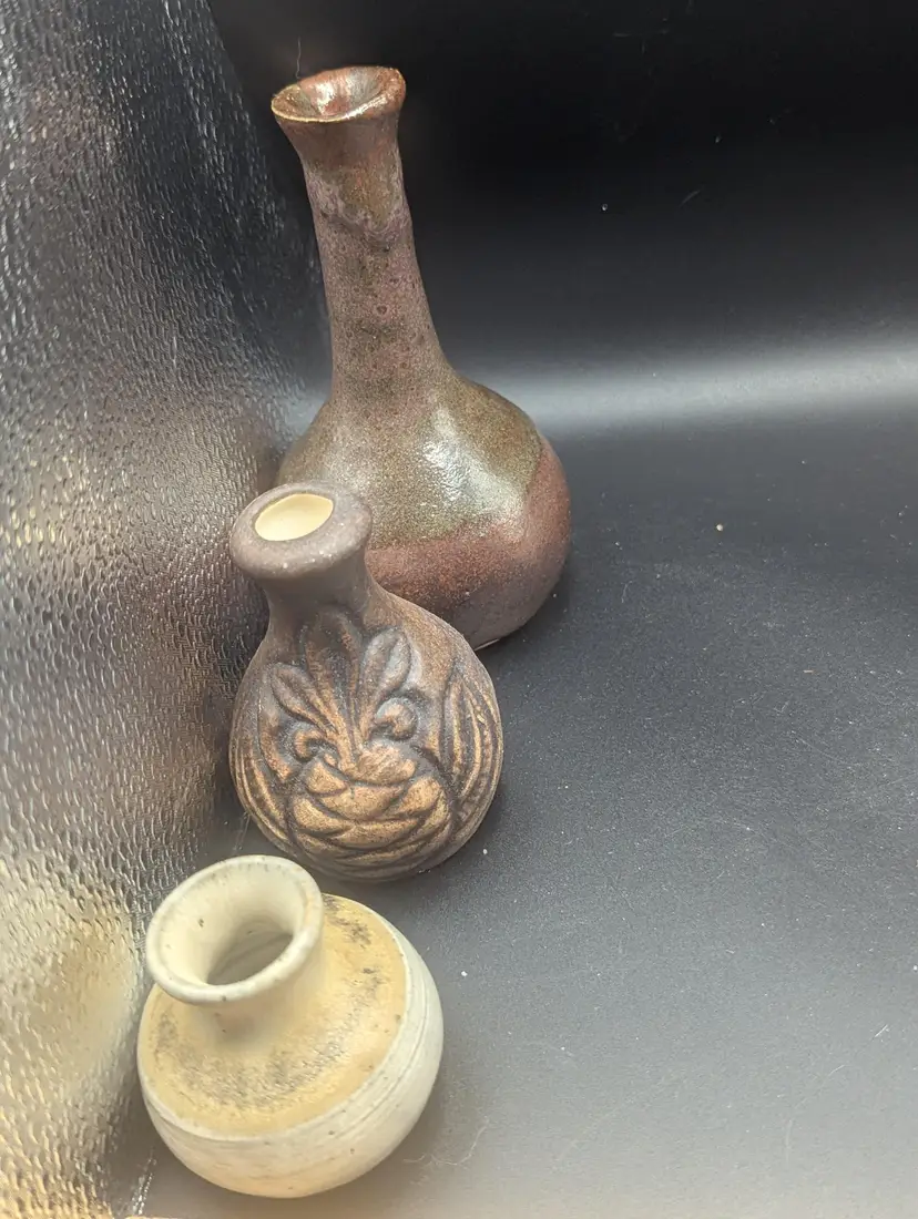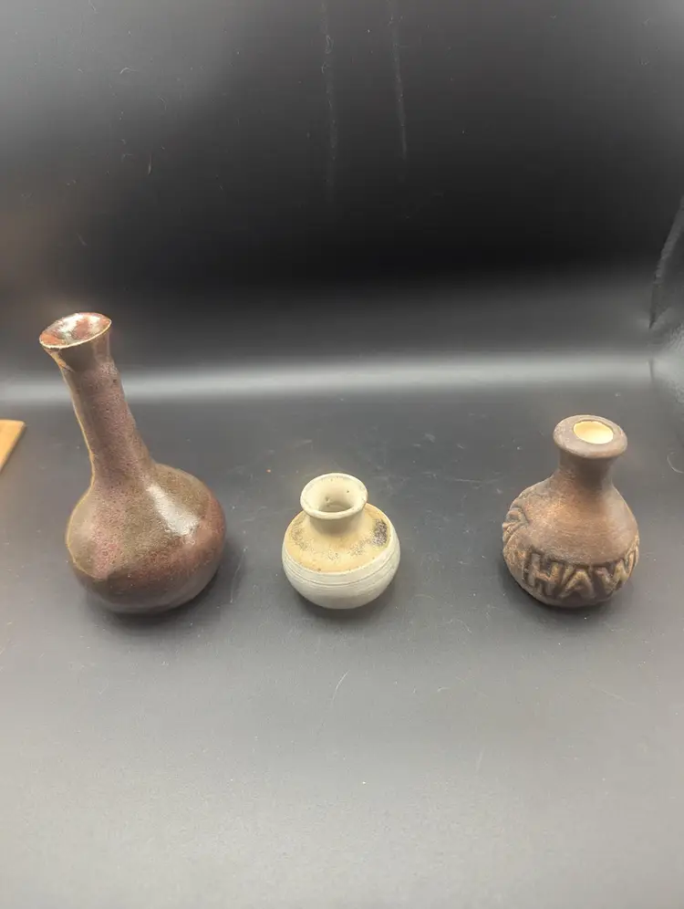 This is a fantastic Trio of Vintage Miniature Pottery Vases Two Studio Art Pottery One Signed One Hawaii Pineapple Vase. The small tan one is signed and dated Guy (Gicas?) 1973. The larger brown vase looks like a Bizen but I don't believe it is. It is stoneware. The smaller brown one is a souvenir for Hawaii but has a pineapple on the opposite side. Add a touch of charm to your collection with this trio of vintage miniature pottery vases. Each piece features unique textures and earthy tones, perfect for displaying on a shelf or desk. Please see all pictures for condition and measurements.