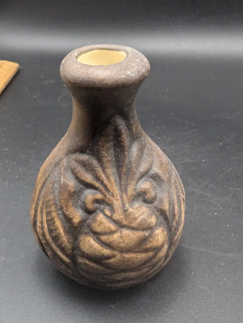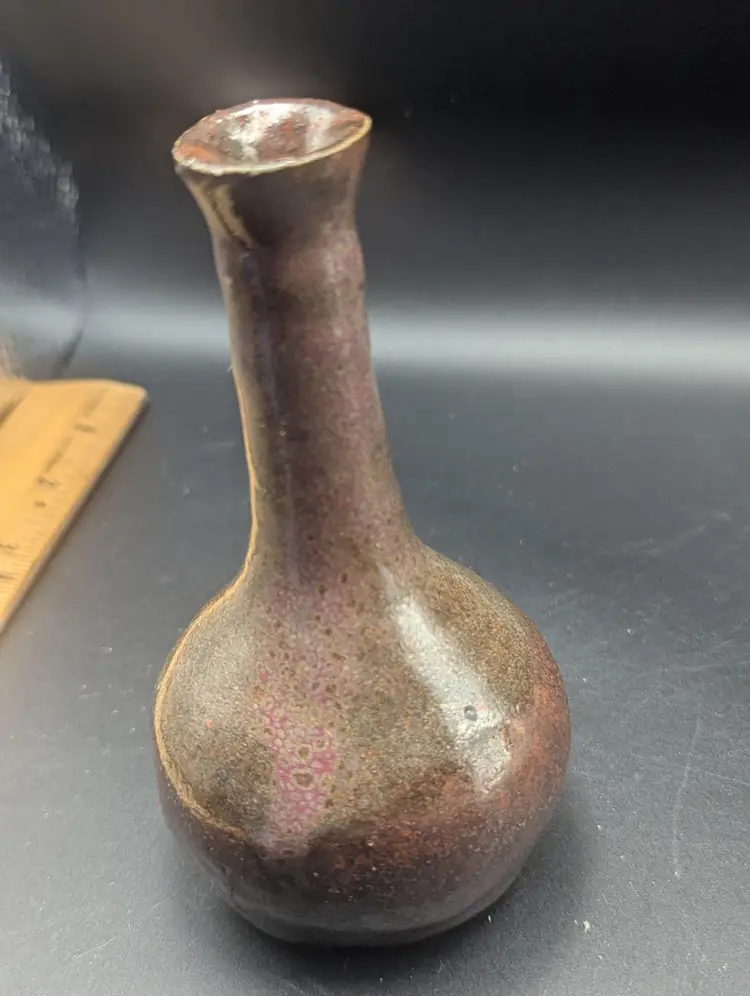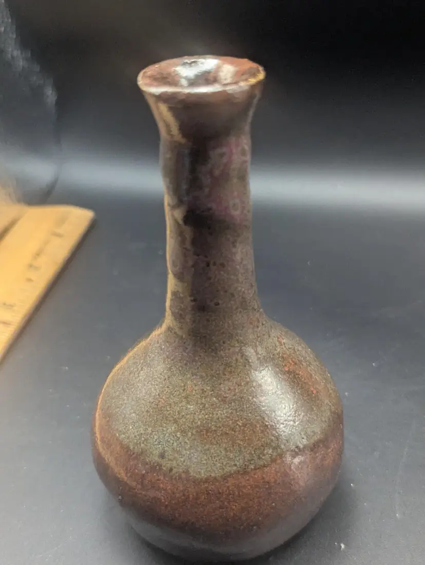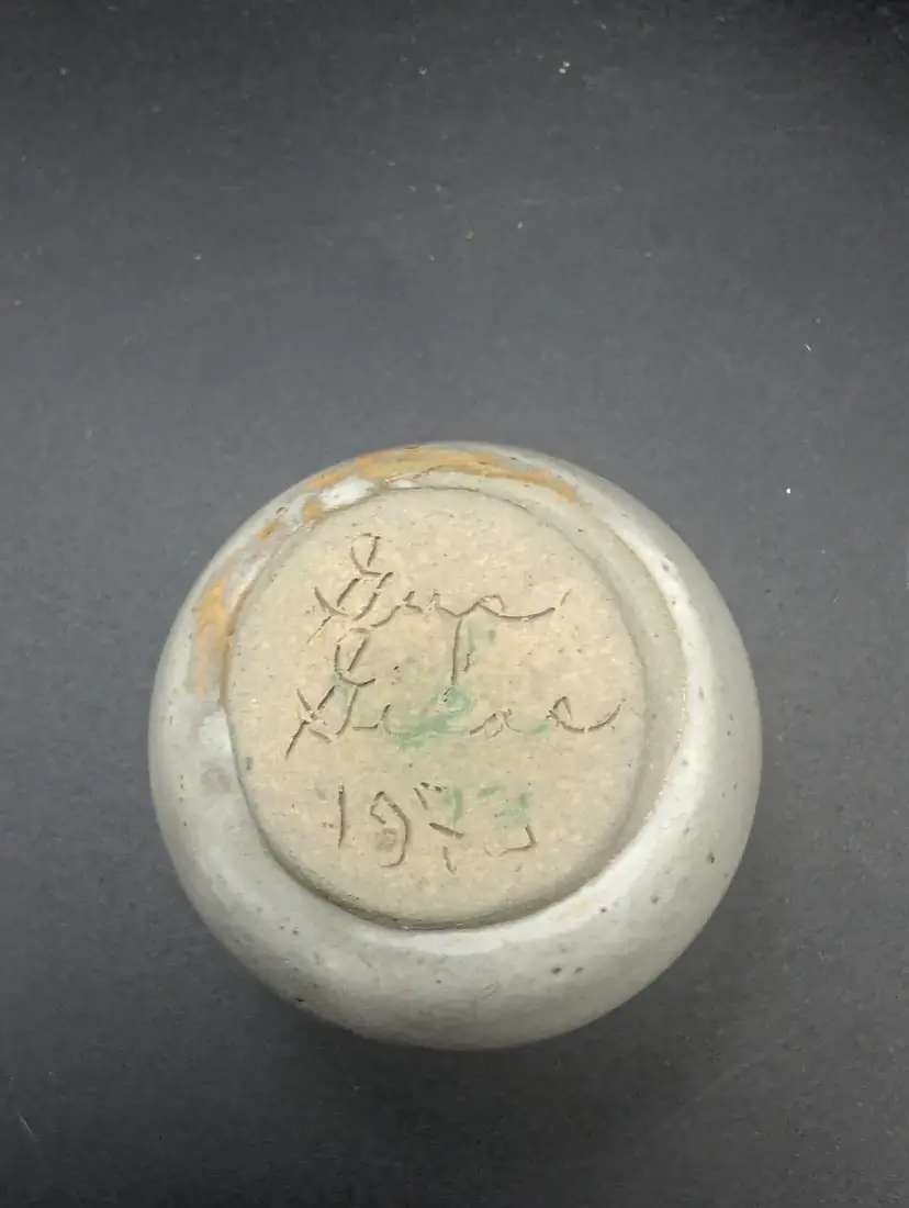 This is a fantastic Trio of Vintage Miniature Pottery Vases Two Studio Art Pottery One Signed One Hawaii Pineapple Vase. The small tan one is signed and dated Guy (Gicas?) 1973. The larger brown vase looks like a Bizen but I don't believe it is. It is stoneware. The smaller brown one is a souvenir for Hawaii but has a pineapple on the opposite side. Add a touch of charm to your collection with this trio of vintage miniature pottery vases. Each piece features unique textures and earthy tones, perfect for displaying on a shelf or desk. Please see all pictures for condition and measurements.