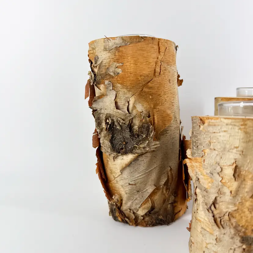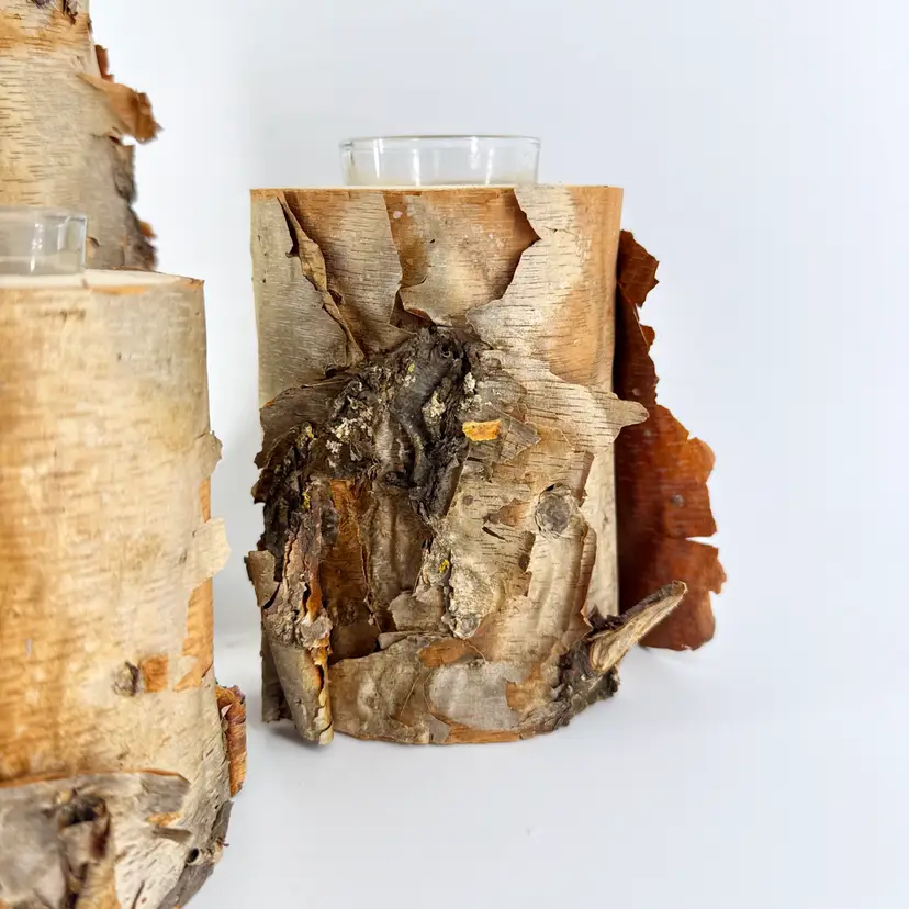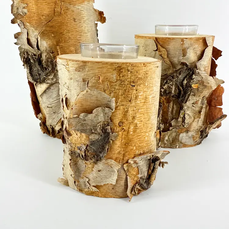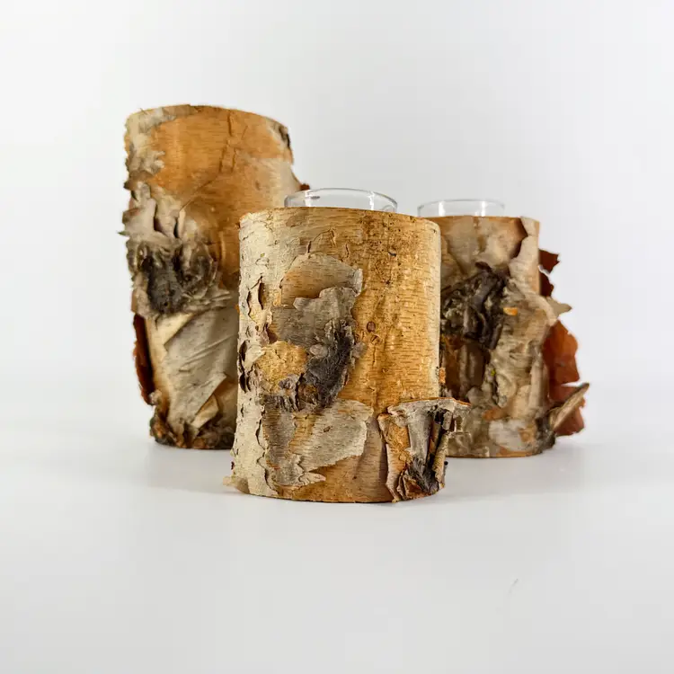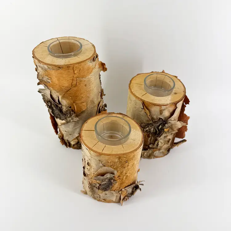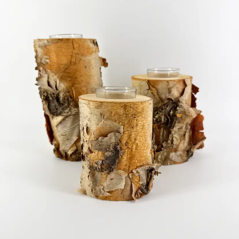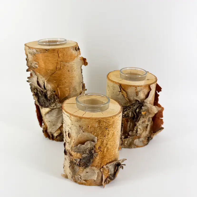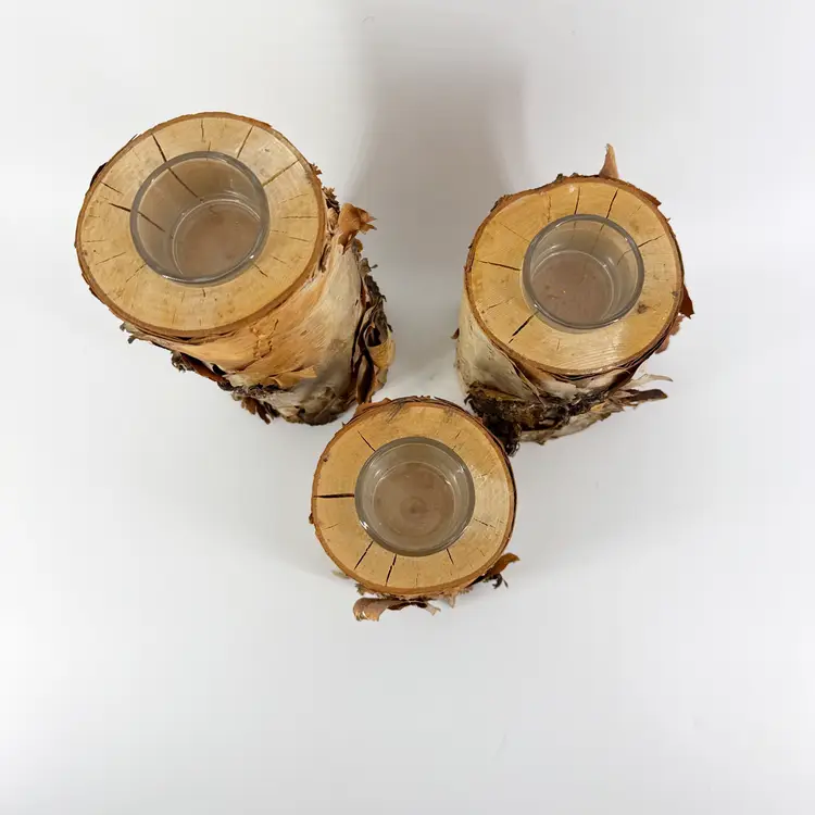 The glass candle holder cups are wedged inside the wood. They are not removable. The sizes are 7.5", 5.25" and 4.5" tall and they are all 3.5" in diameter. They are in excellent condition. There are no cracks, breaks, chips or repairs. (See photos).
