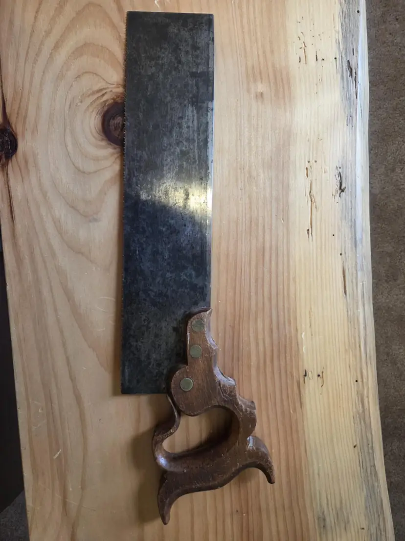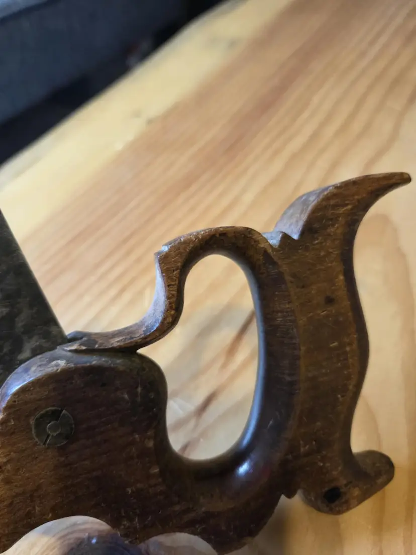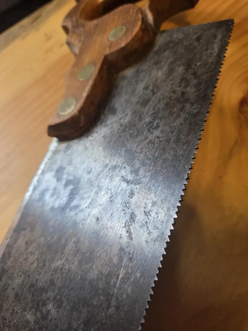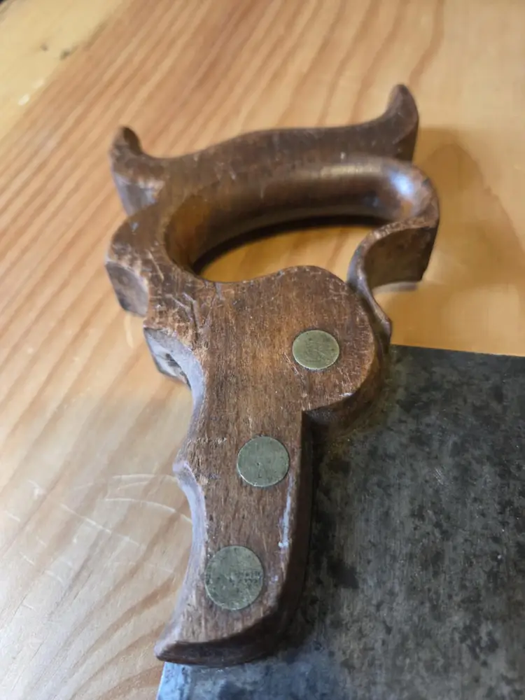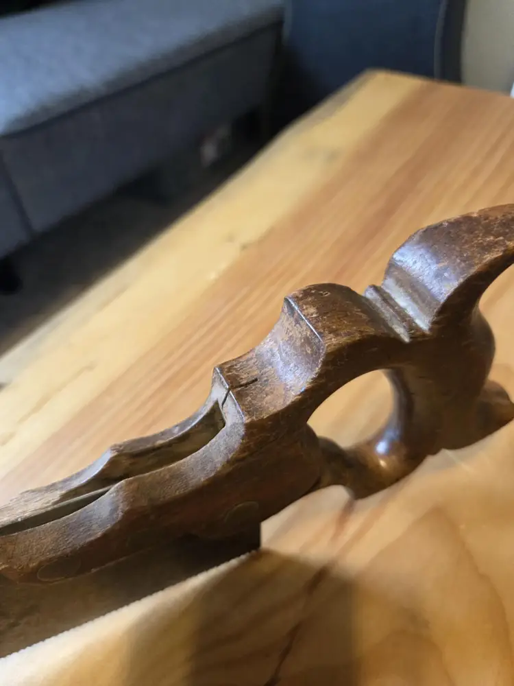 Unmarked. Handle in overall good condition except one chip as shown with split nuts. Saw plate is straight. Slight pitting in blade but would not affect performance. It will definitely need to be re-filed as teeth are not sharp.