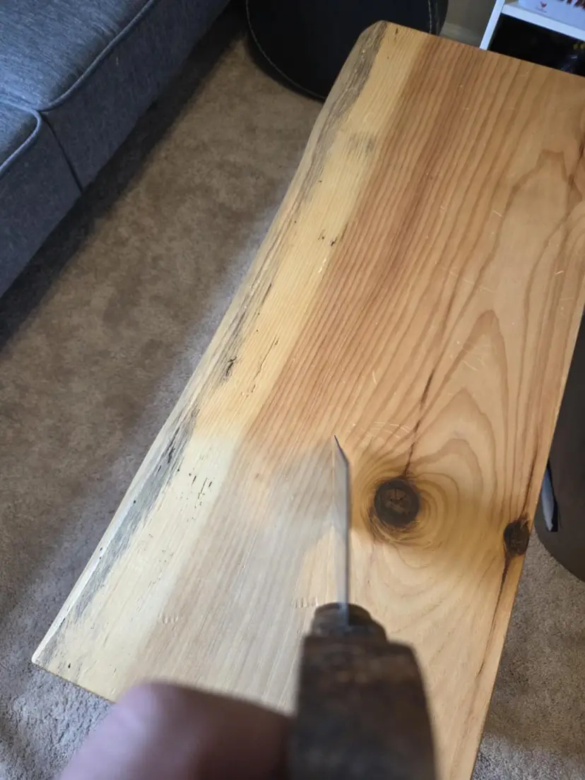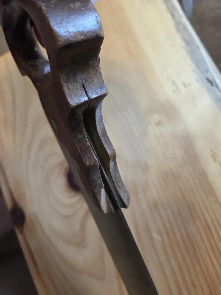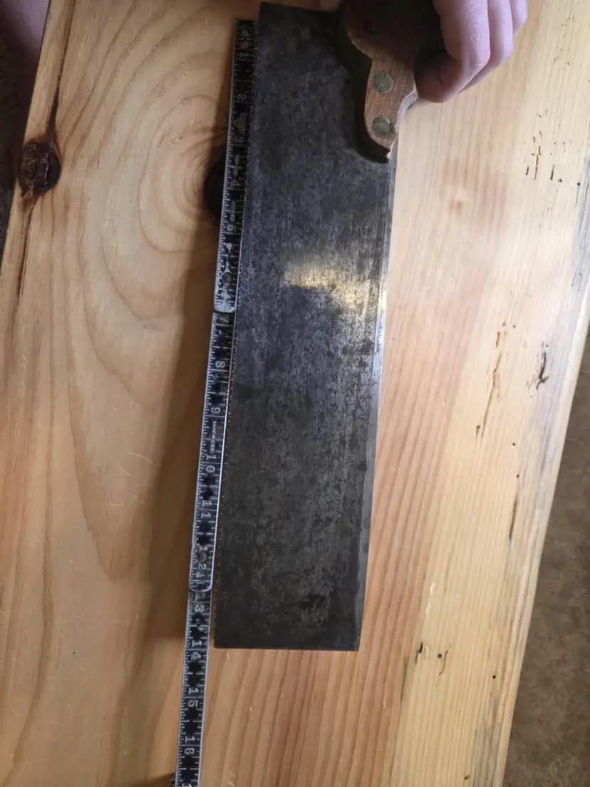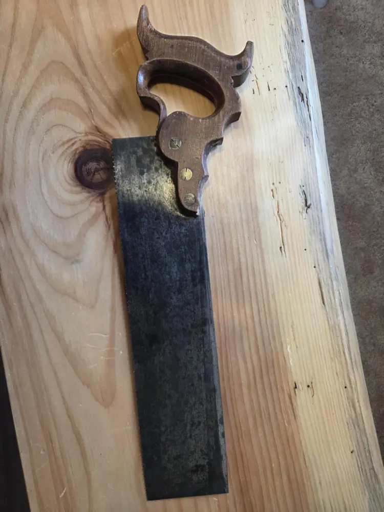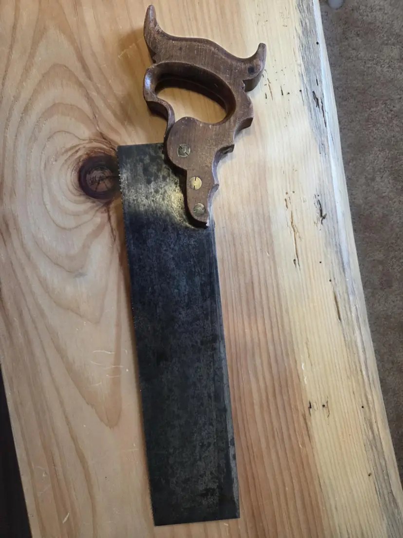 Unmarked. Handle in overall good condition except one chip as shown with split nuts. Saw plate is straight. Slight pitting in blade but would not affect performance. It will definitely need to be re-filed as teeth are not sharp.