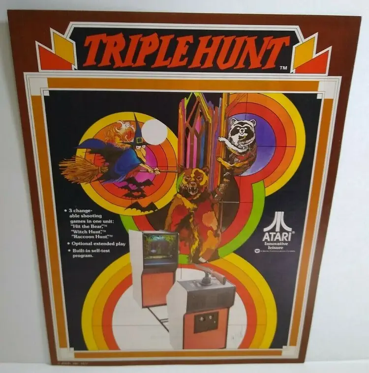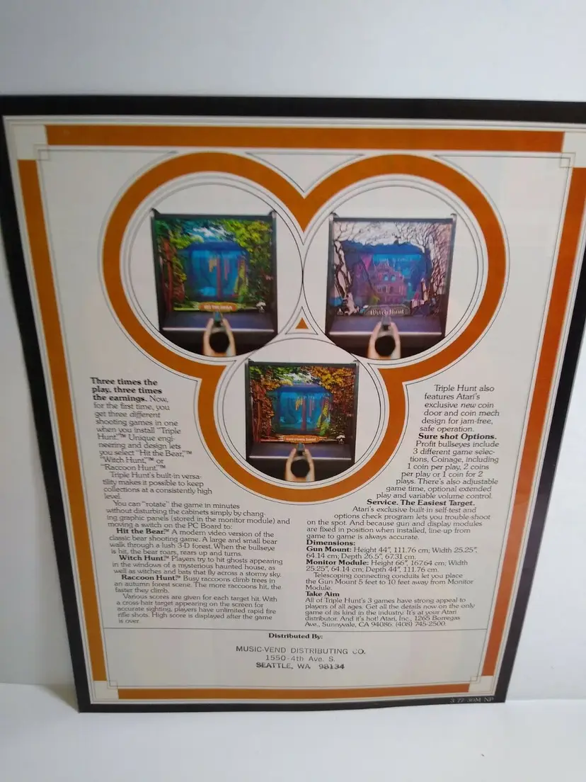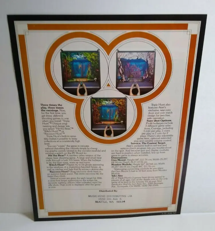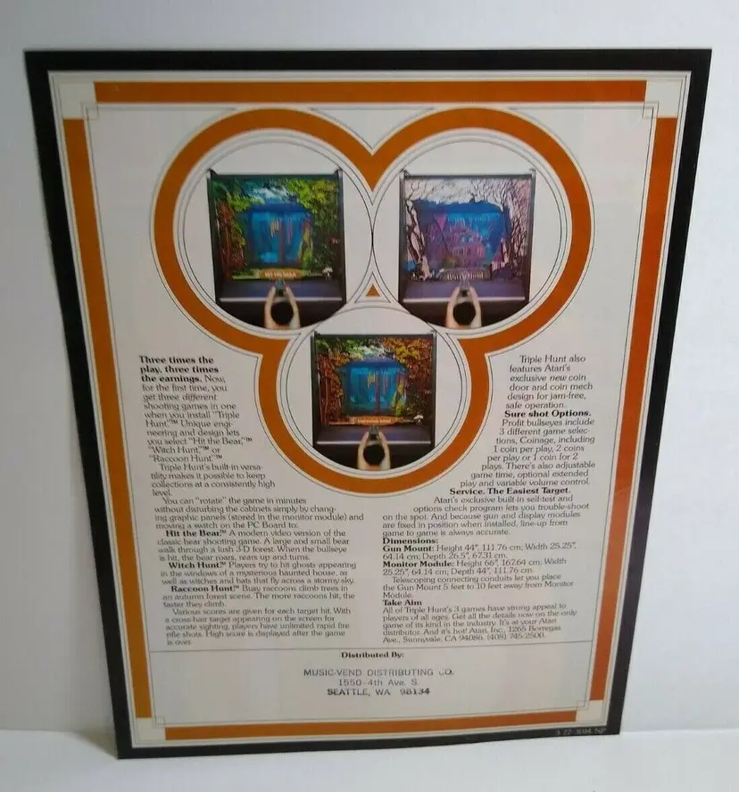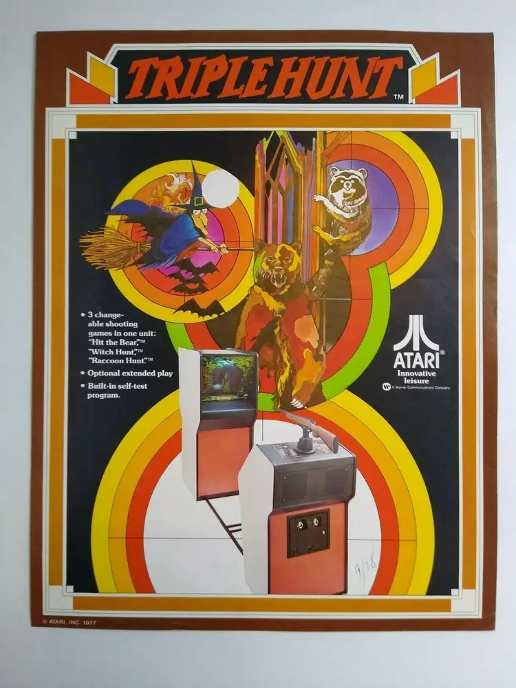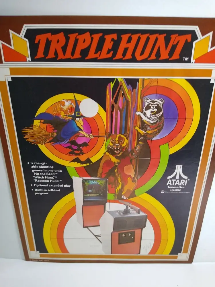 Arcade: Flyer Theme: Retro Gaming Modified Item: No Country/Region of Manufacture: United States Original/Reproduction: Original Year: 1977 Game Title: Triple Hunt Brand: Atari