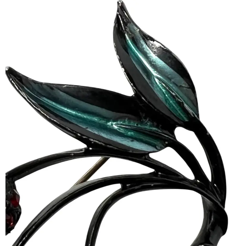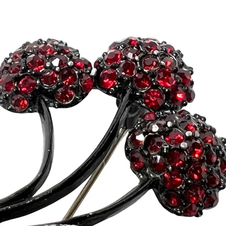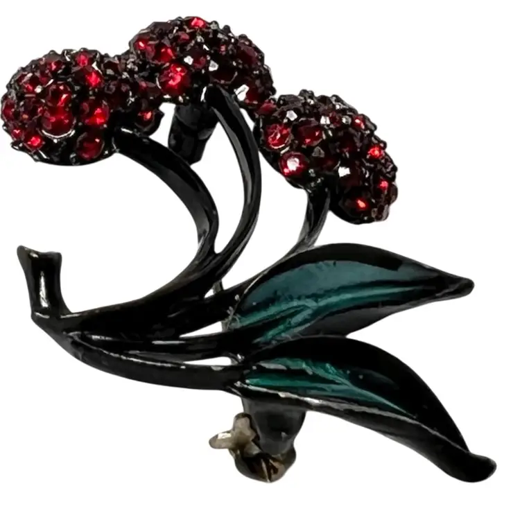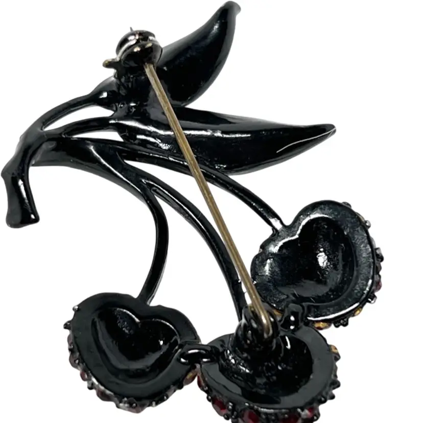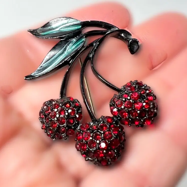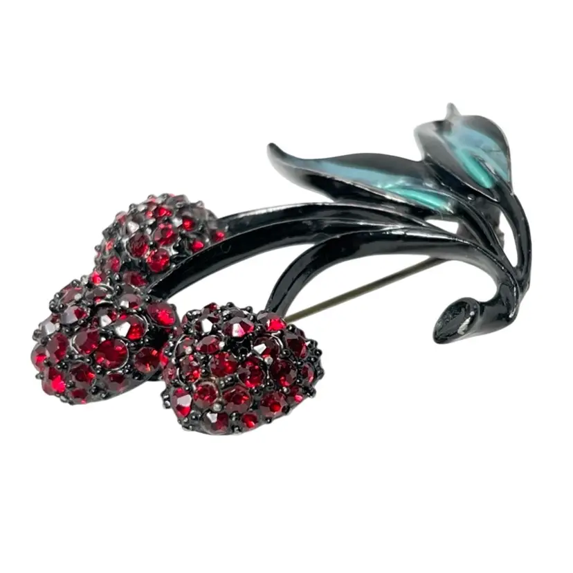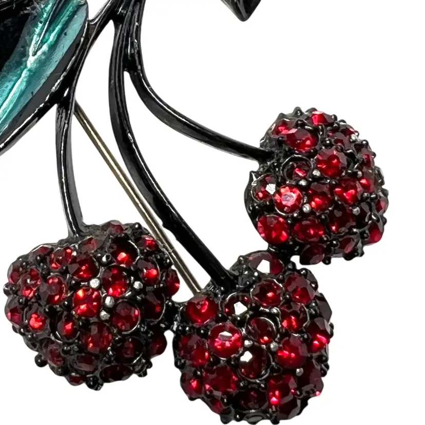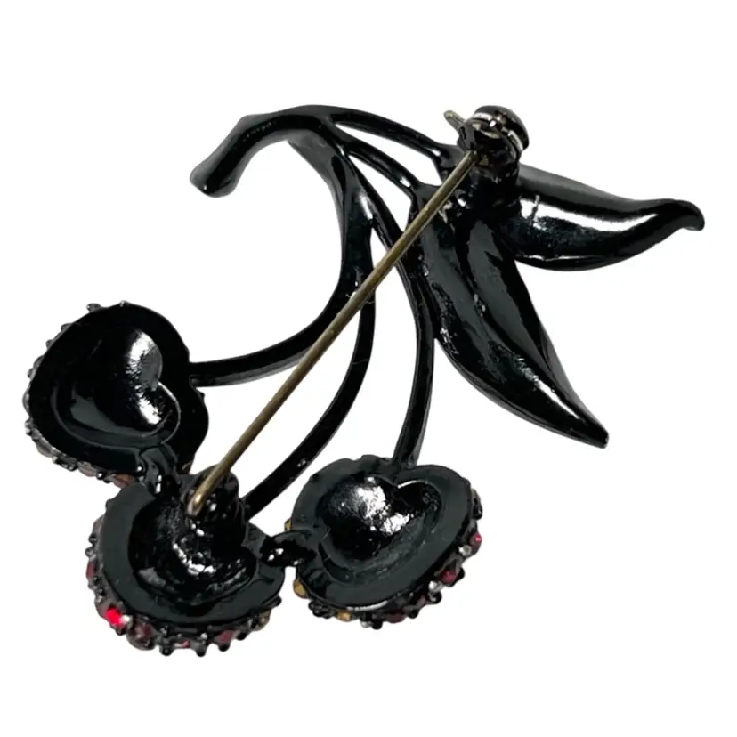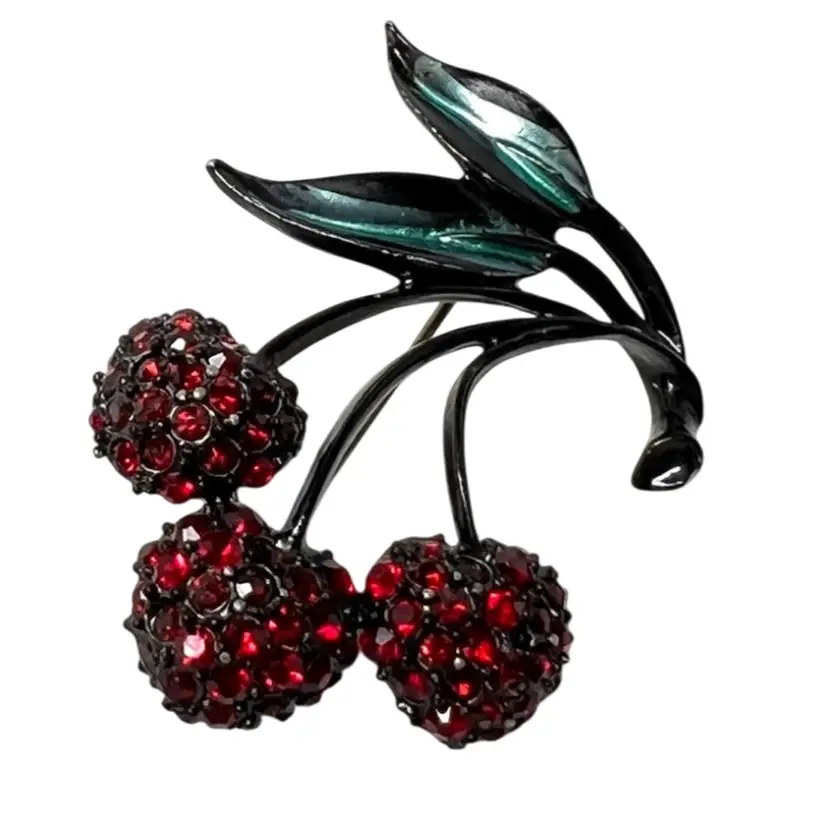 Triple Red Cherries ๐ Crystal Brooch Pin. 3 Lucious Red Cherries With Black Metal Stems and Enamel Green Metal Leaves. Black metal backing. Unsigned. Nice clasp. 1-3/4โ x 1-5/8โ x 1/2โ. Condition: No missing stones.