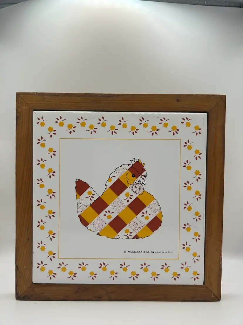 1983 vintage ceramic and wood tile trivet by M. Kamestein, Inc. part of the “Posies and Plaid” collection