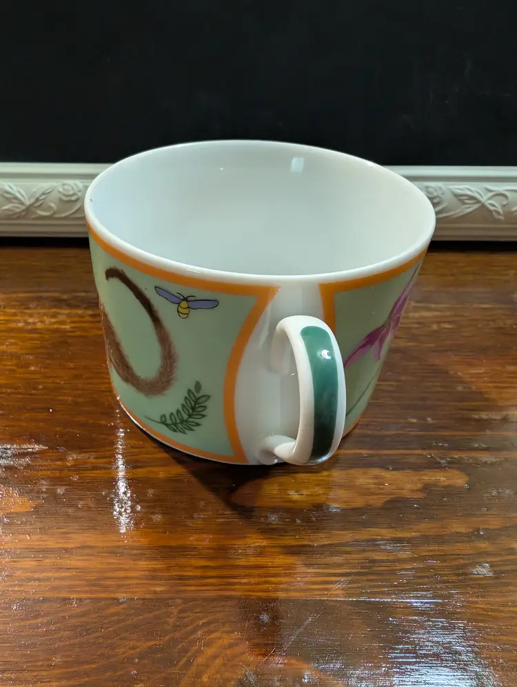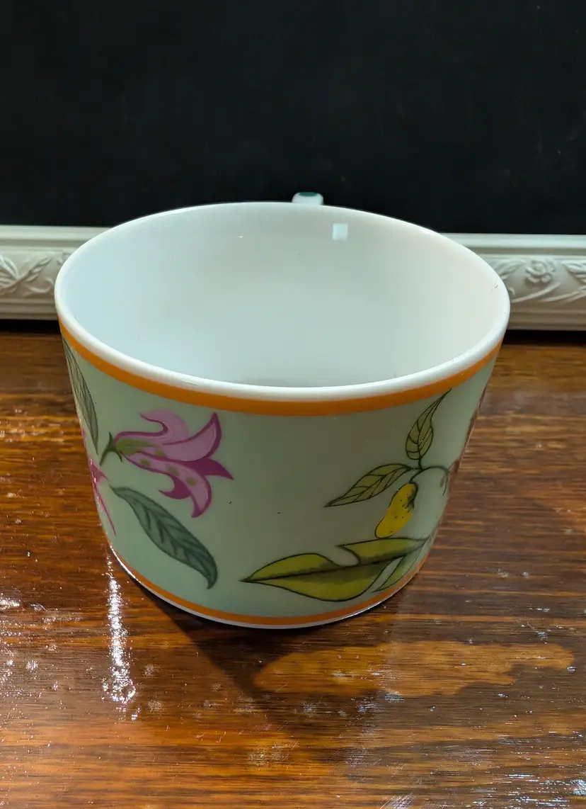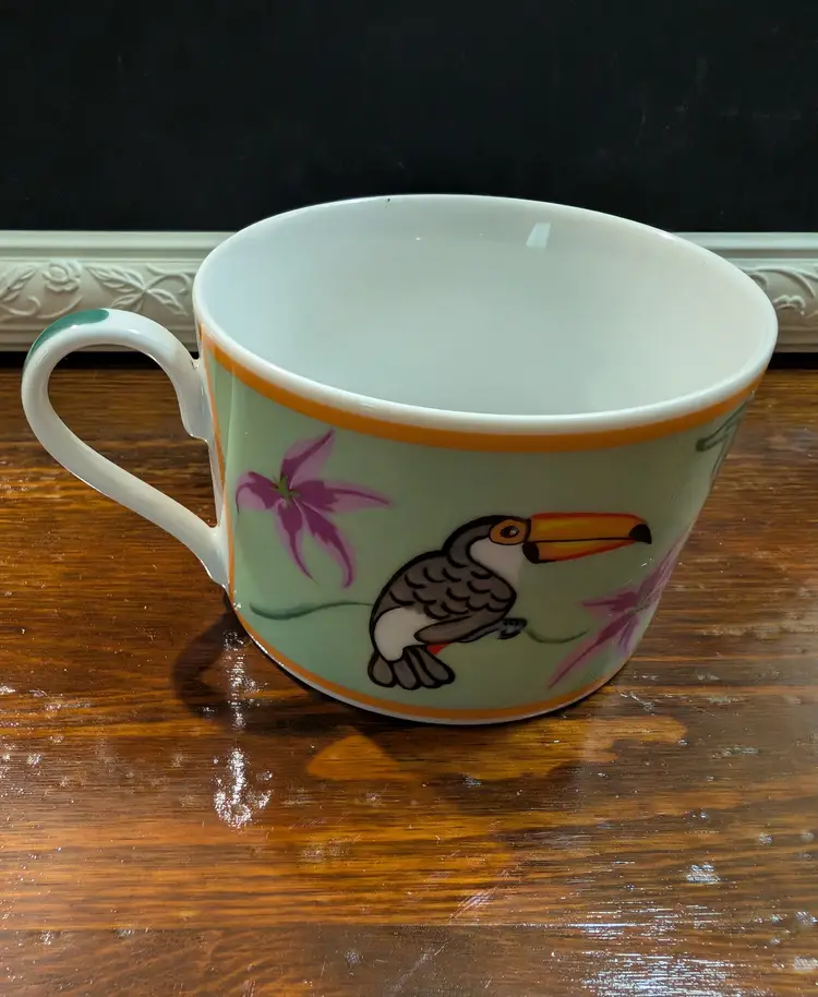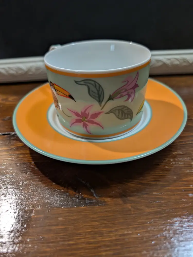Tropical designed teacup with saucer. This is a two-piece set teacup and saucer that is in excellent condition with no chips, cracks or scratches. The cup has a tropical design around the base including tropical birds, a monkey, floral and fruit design. Plate has an orange rim and white center and is approximately 6 inches round diameter. The cup is approximately 3.5 inches round diameter and 4.5 inches length from rim to to handle of cup. Both are unmarked but very well made. Very cute 2-piece set.