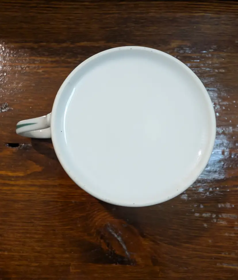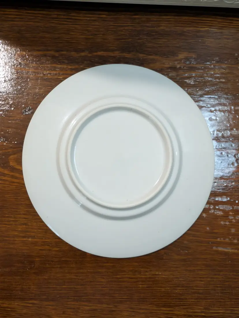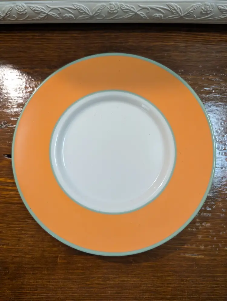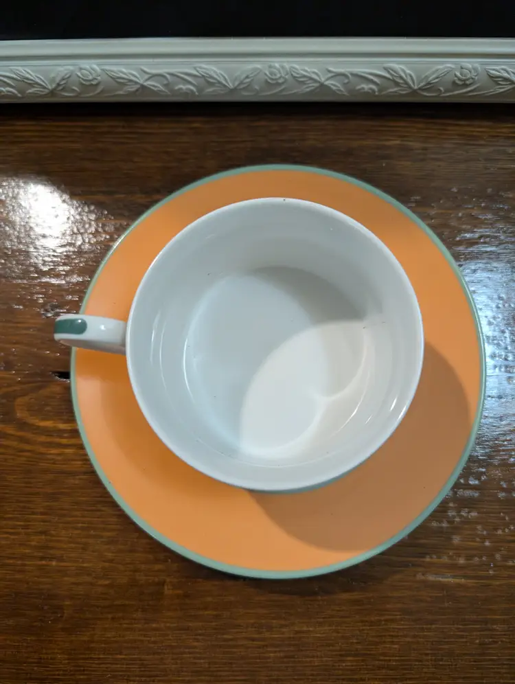 Tropical designed teacup with saucer. This is a two-piece set teacup and saucer that is in excellent condition with no chips, cracks or scratches. The cup has a tropical design around the base including tropical birds, a monkey, floral and fruit design. Plate has an orange rim and white center and is approximately 6 inches round diameter. The cup is approximately 3.5 inches round diameter and 4.5 inches length from rim to to handle of cup. Both are unmarked but very well made. Very cute 2-piece set.