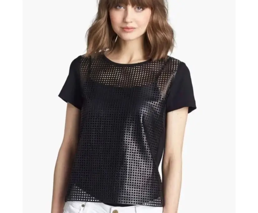 Super cool perforated black leather top from Nordstrom. Boxy fit. Not a boring t-shirt. This ultra cool Tee has a perforated leather front (completely see through) and plain black fabric in back. Mid-length. Round collar. Wear a cropped tank underneath with black everything else for a 🖤 look. Trouvé brand. Please see all photos and measurements to ensure proper fit.