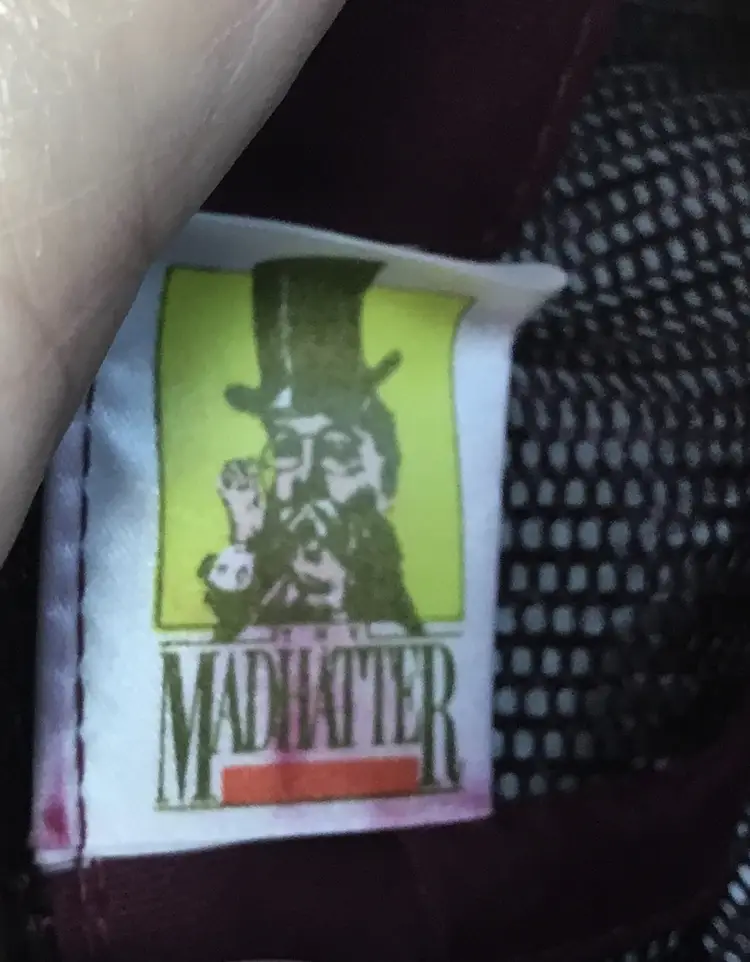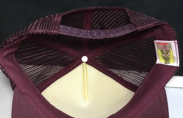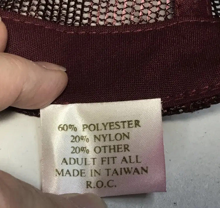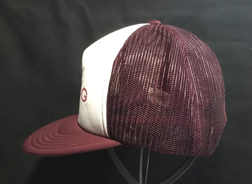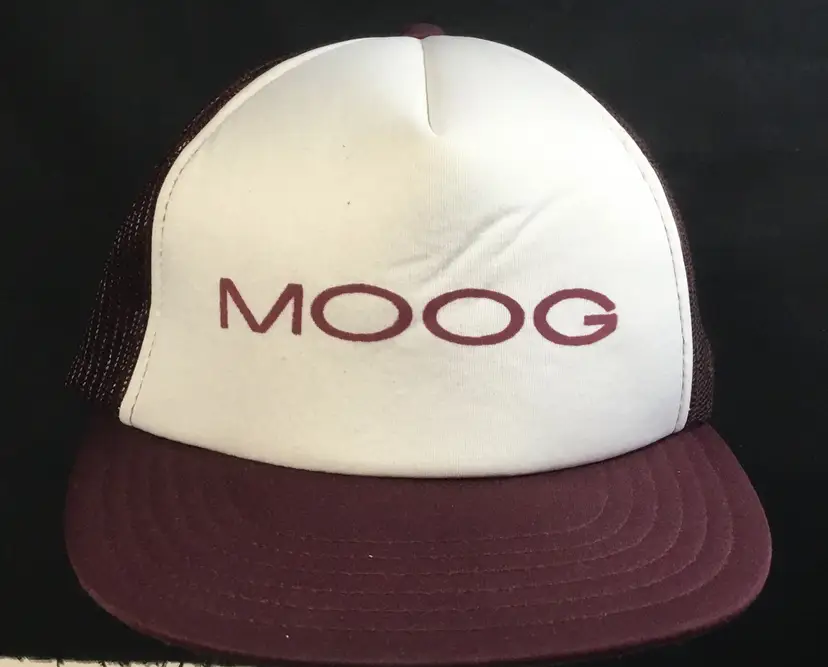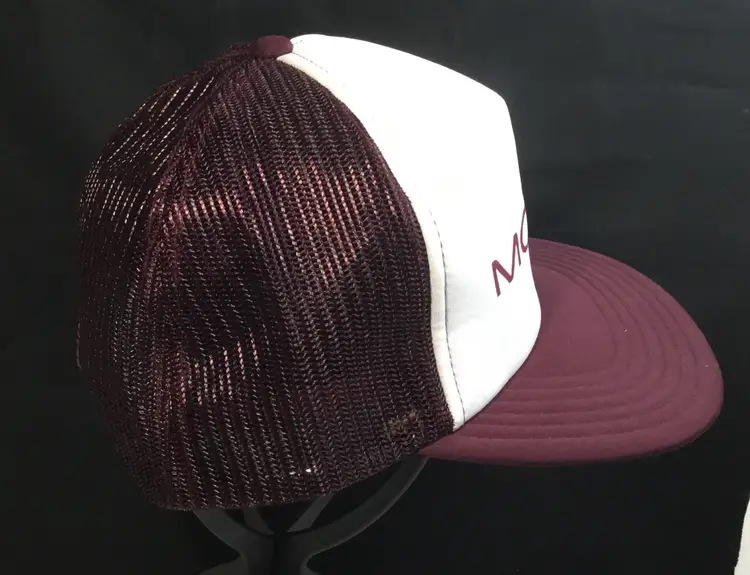 Mesh crown, foam insert, truckers hat. Maroon crown and brim, white front with MOOG in large letters. Mad Hatter brand. 60% polyester, 20% nylon, 20% other. Made in Taiwan.