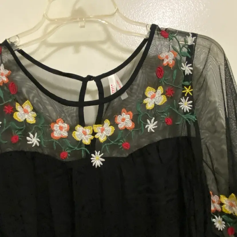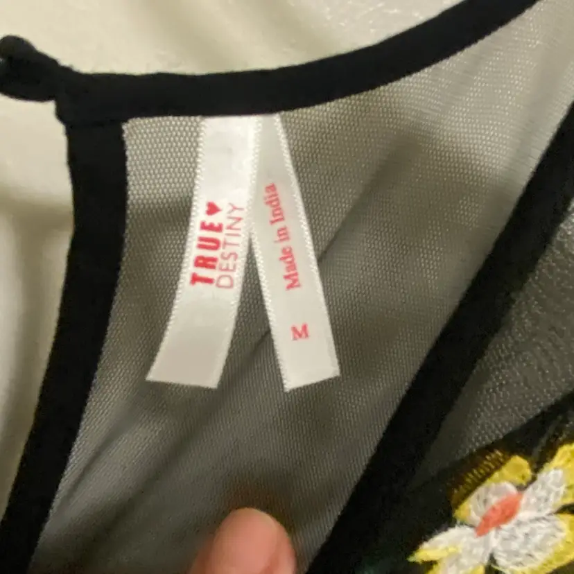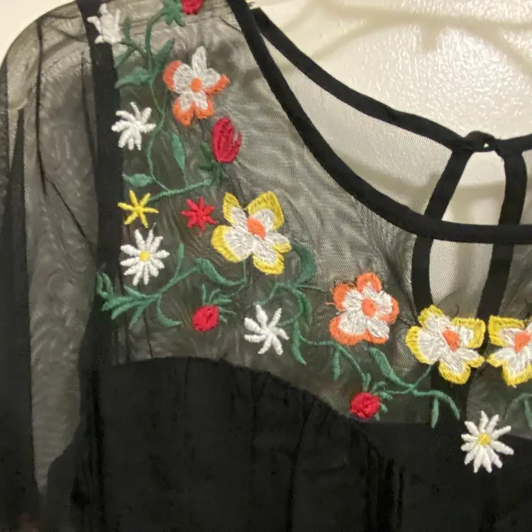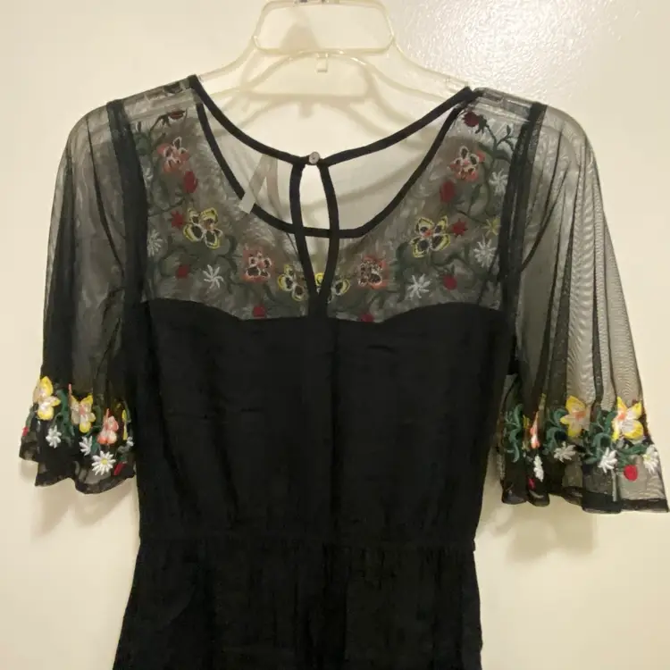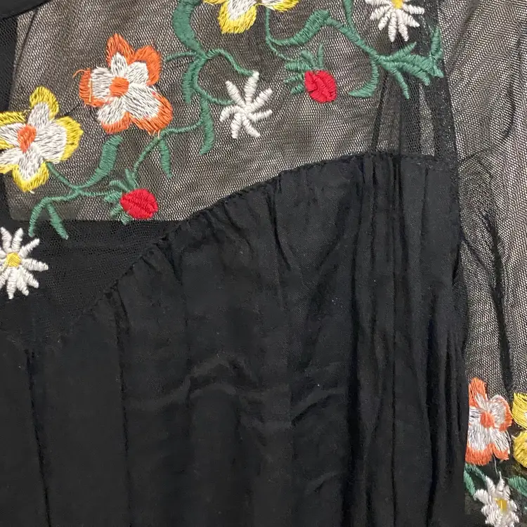 True Destiny Womens Black Mini Dress M 36” Embroidered Floral Flowers Embroidery Excellent condition with no wear, fading, stains or damages Pit to pit across is 28” for bust measurement of 36” Waist is elastic measuring 12” flat and 16” stretched for waist of up to 32” Length 31” 100% Rayon #minidress #embroidered #embroidery #floral #flowers