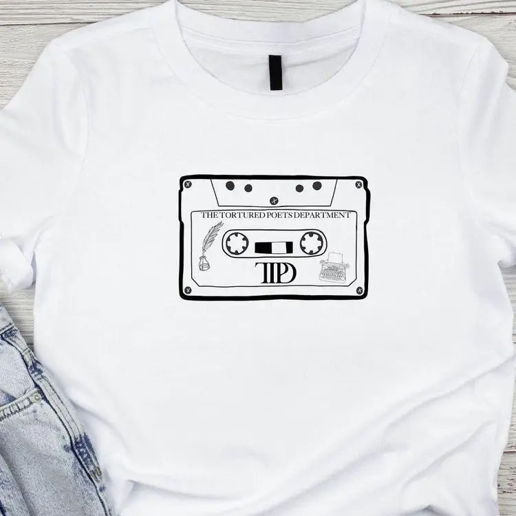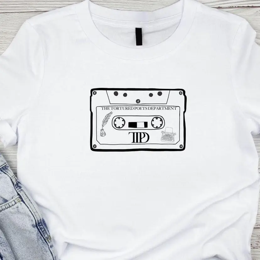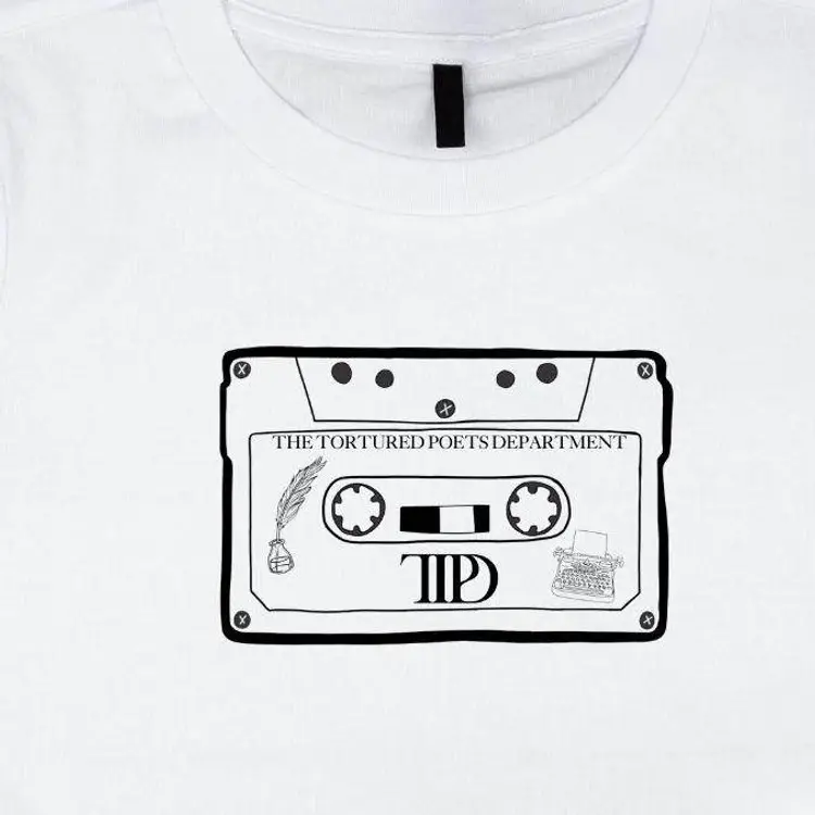 TTPD inspired tee features a cassette with TTPD logo + a quill pen & type writer!