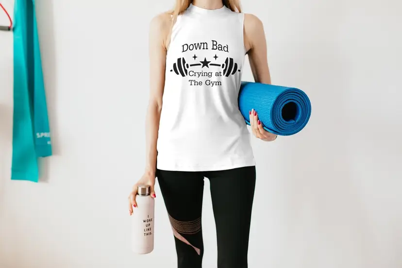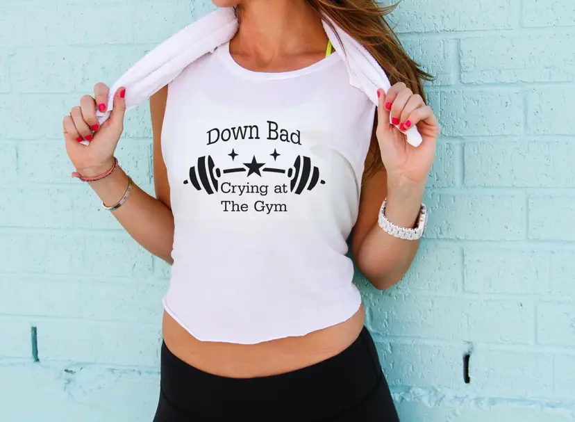 "Introducing our 'Down Bad Crying at the Gym' tank top, inspired by Taylor Swift's latest hit, 'Down Bad,' from her album 'The Tortured Poets Department.' Embrace the raw emotion and vulnerability with this edgy yet relatable design. Perfect for your toughest workouts or those days when you just need to let it all out. Made from high-quality materials for ultimate comfort and durability. Get ready to turn heads and make a statement wherever you go. Order yours now and let your emotions shine!"