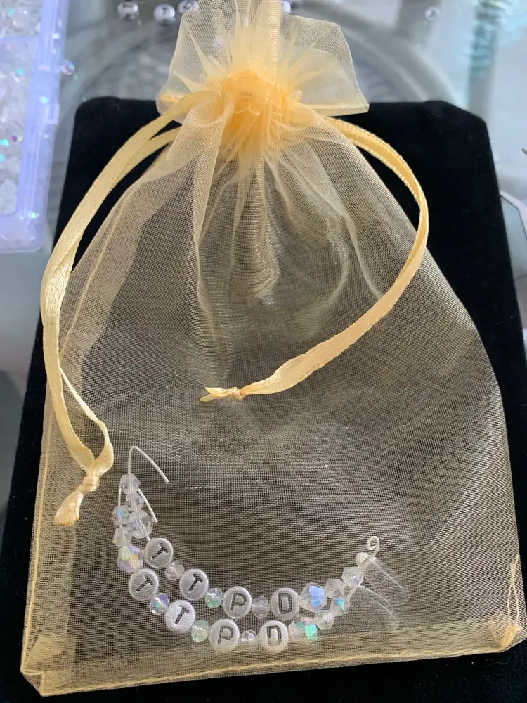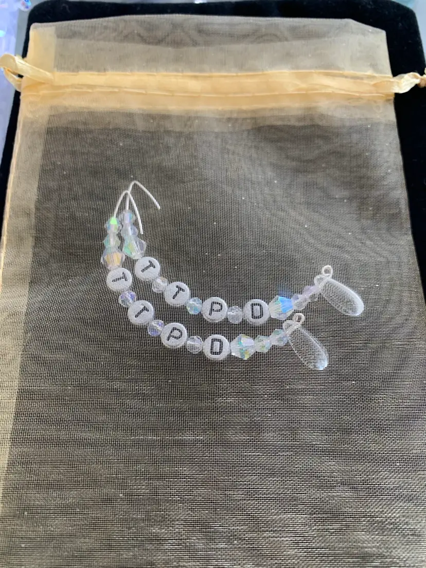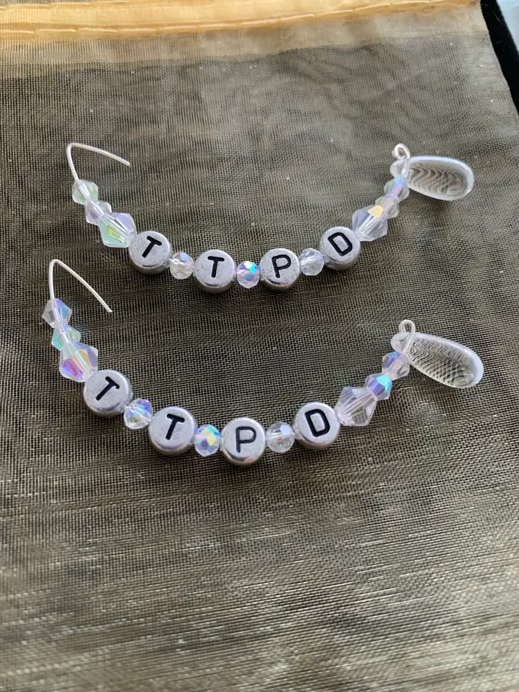 ARE YOU READY FOR IT??? MBEADESIGNS EXCLUSIVE. Get ready for 4/19/24 with your custom designed Featherweight TTPD 1/2 moon shaped dangle earrings on silver wire with glass crystals and silver TTPD letters and a beautiful clear glass teardrop. Easily slides through earring hole and stays secure with the 1/2 moon design. Lightweight and comfortable. Presented in a gold silken bag for safe keeping. Find me on FB for more of my designs @ MBeaDesigns Luxury Friendship Bracelets