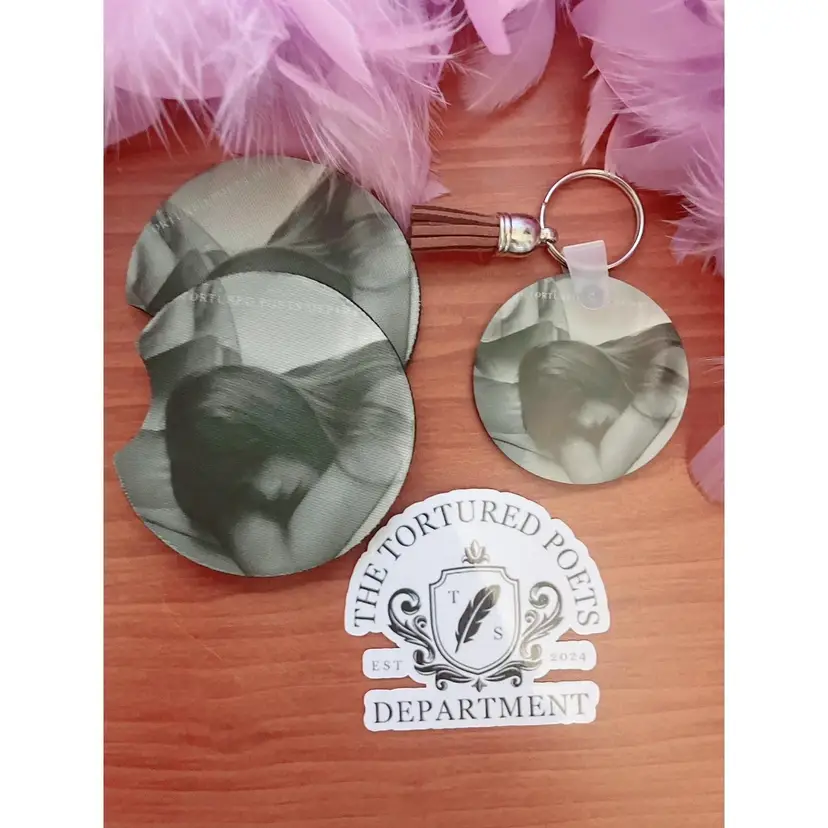 2 car coasters, 1 double sided keychain, 1 laptop sticker