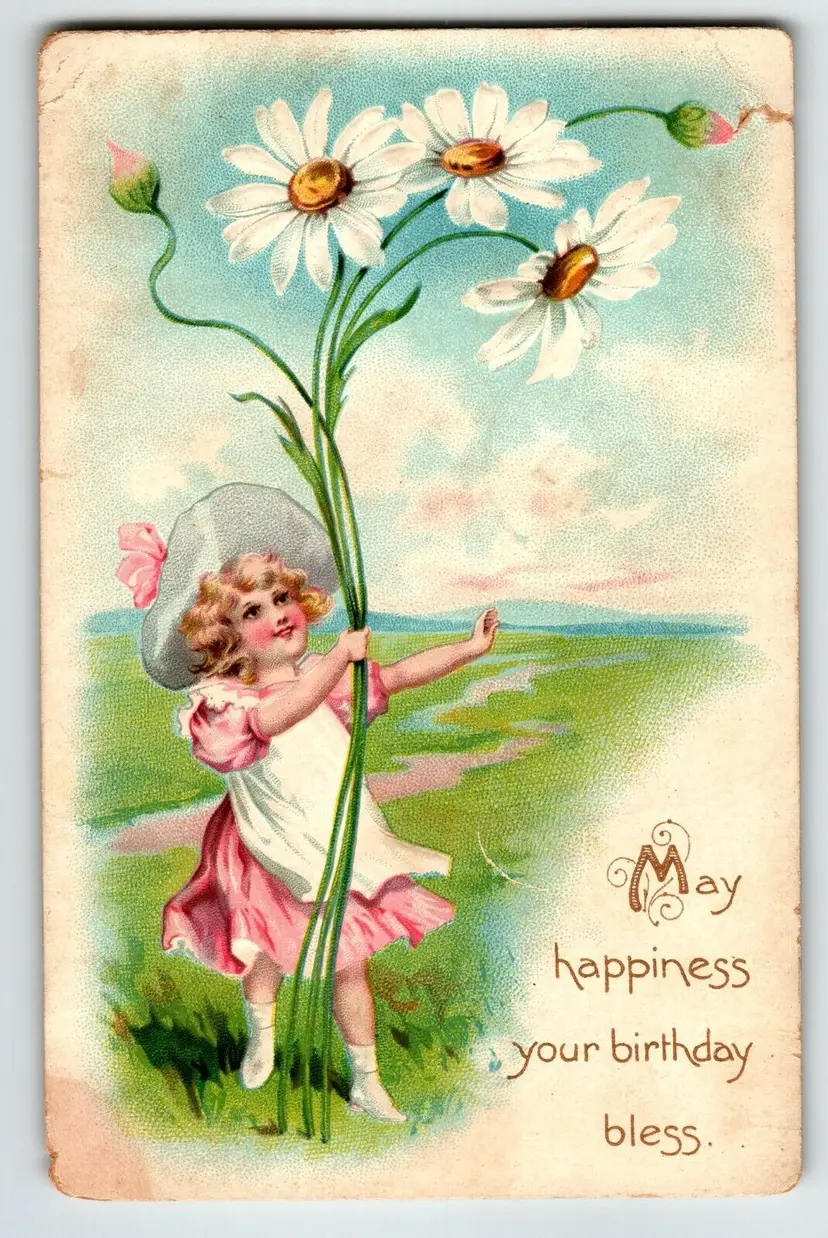 Number of Items in Set: 1 Unit of Sale: Single Unit Artist: Unknown Occasion: Birthday Size: Standard (5.5 x 3.5 in) Signed: No Custom Bundle: No Material: Paper Year Manufactured: 1907 Original/Licensed Reprint: Original Brand/Publisher: Raphael Tuck & Sons Subject: Flowers Type: Printed (Lithograph) Era: Pre-War (Pre-1914) Theme: Art, Children & Infants, Daisies, Flowers, Flowers & Plants, Girl, Greetings Features: Divided Back, Embossed Time Period Manufactured: 1900-1919 Country/Region of Manufacture: United States Postage Condition: Posted
