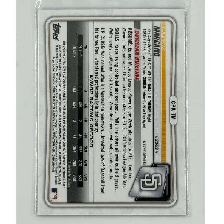 Tucupita Marcano 2020 Bowman Chrome Blue Mojo Refractor 1st Auto San Diego Padres Card # CPATM Card Serial #005/150