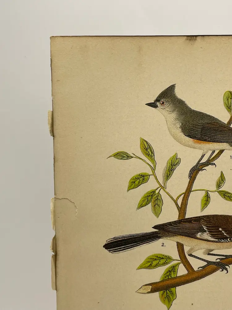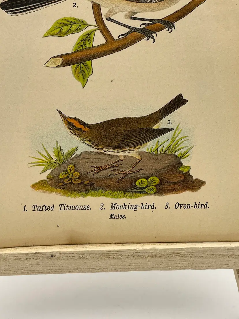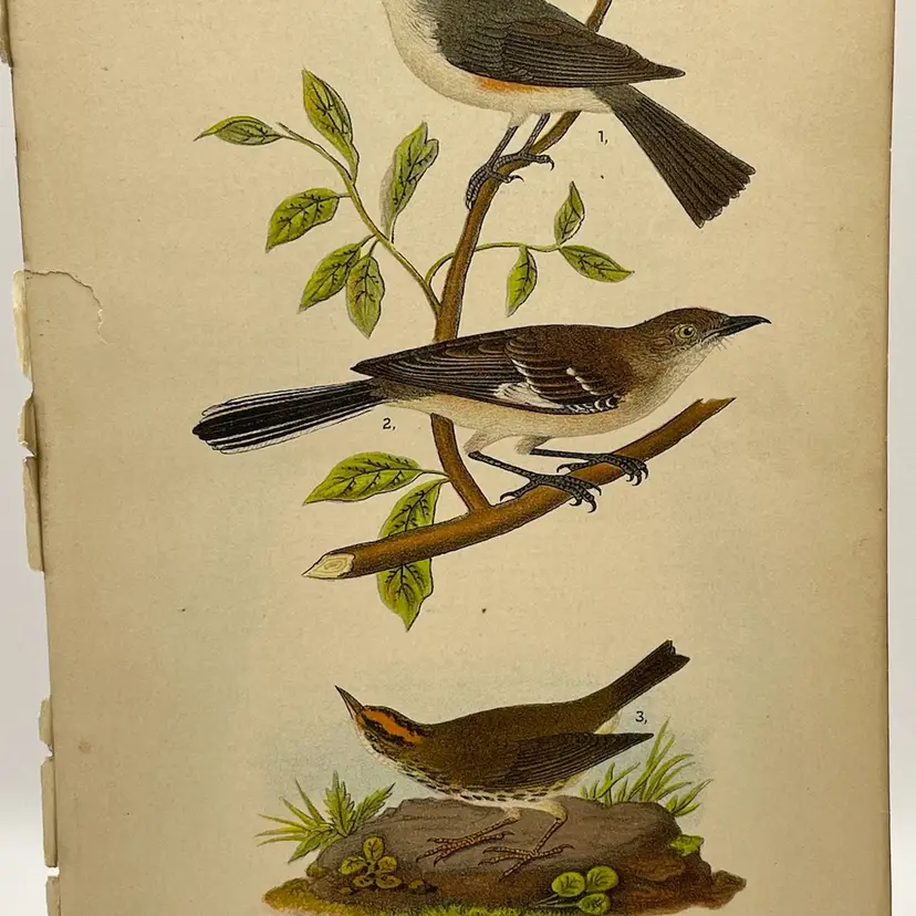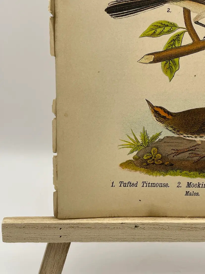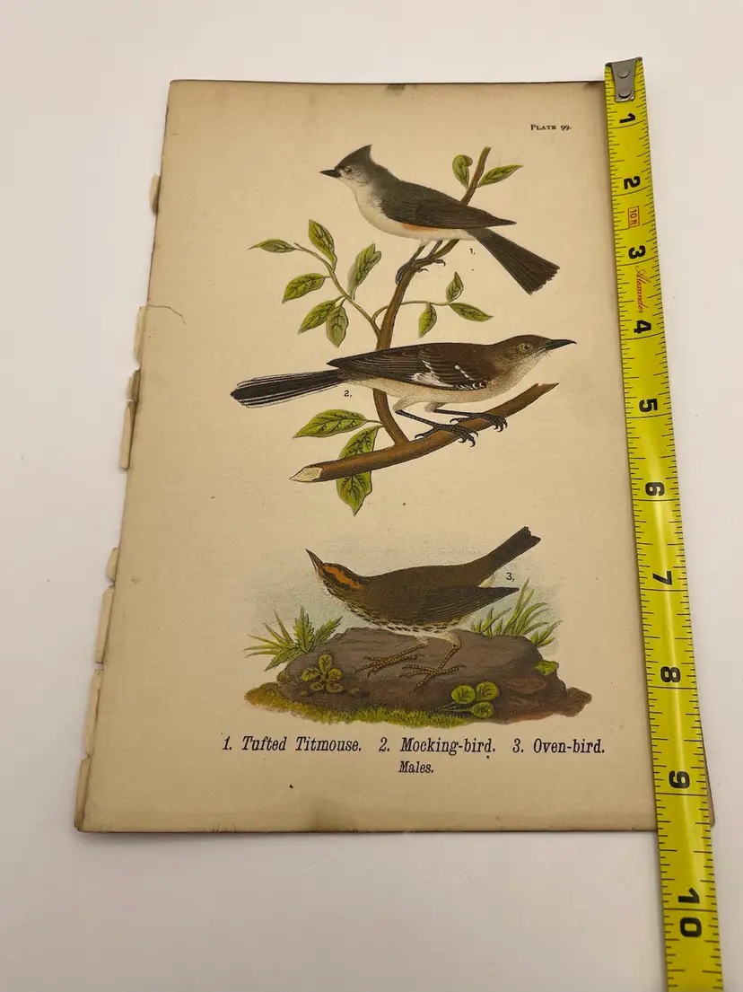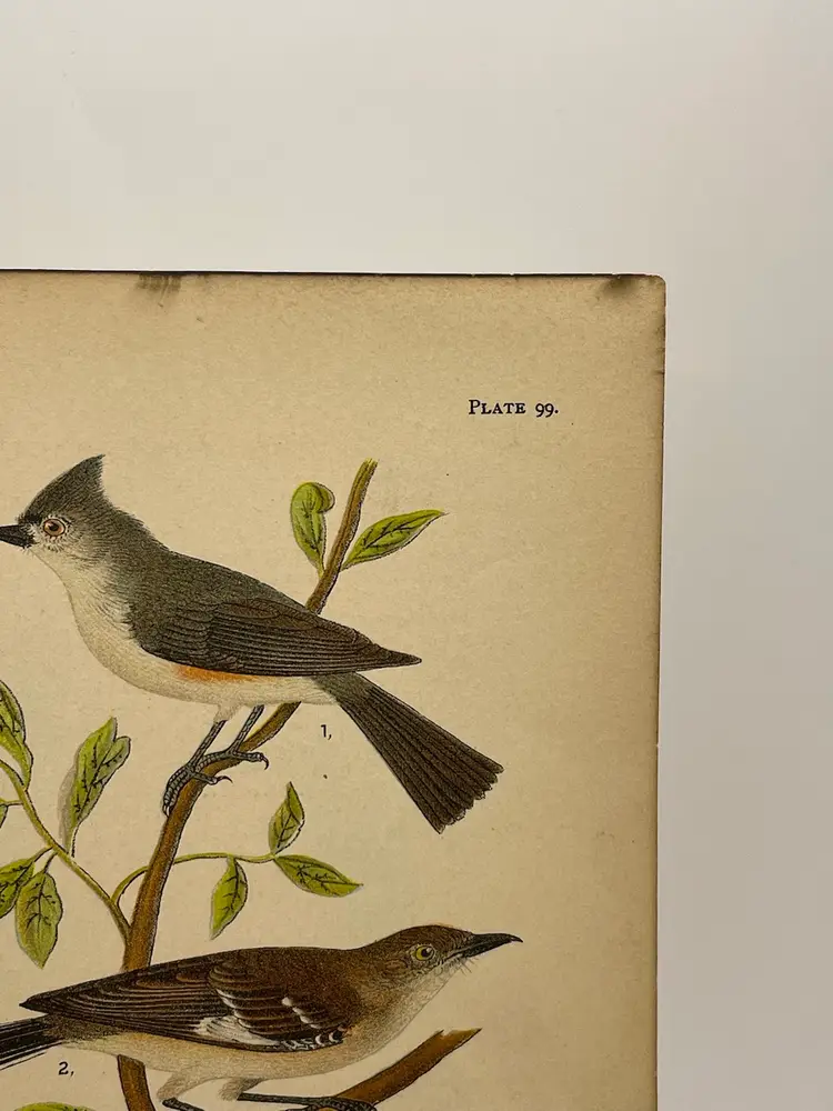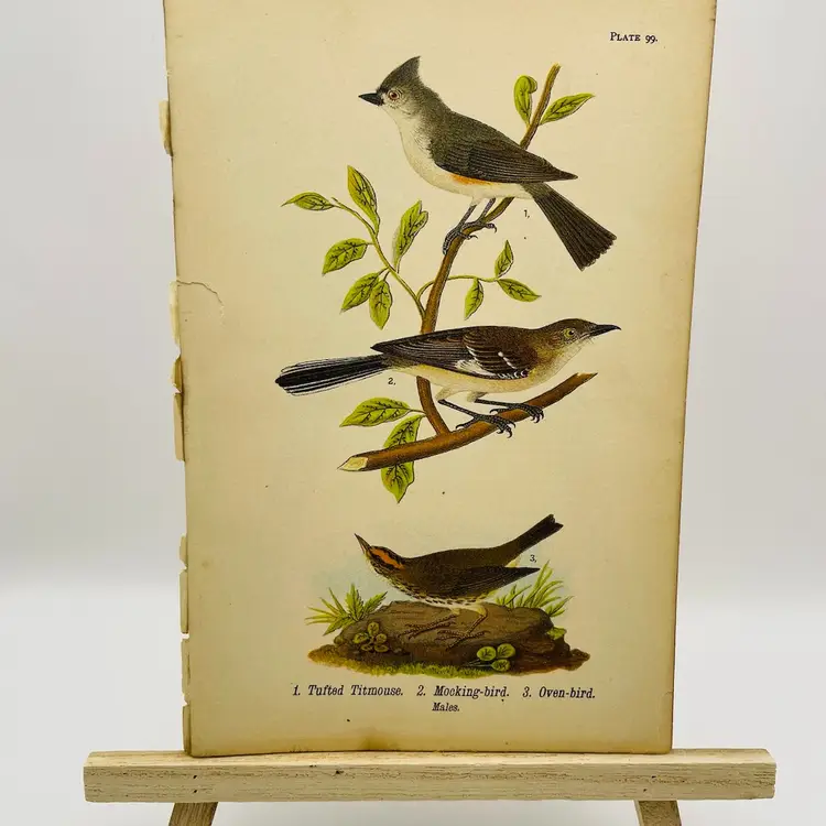 “Tufted Titmouse”/“Mocking-bird”/“Oven-bird”, c. 1890 Color Plate Engraving, Plate 99, From An Antique Book Please see pictures for measurements.