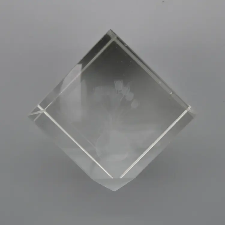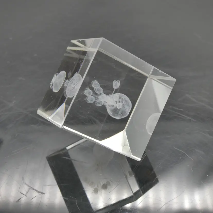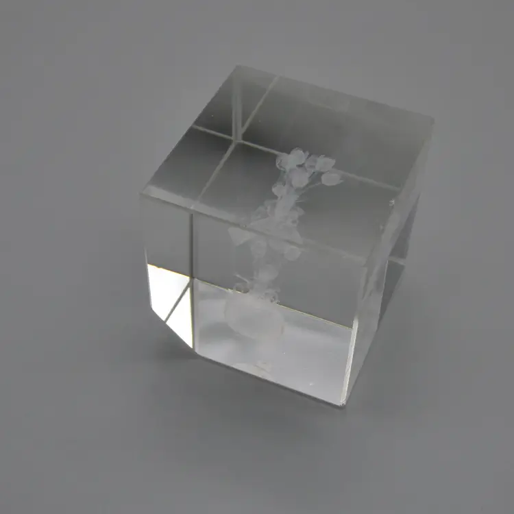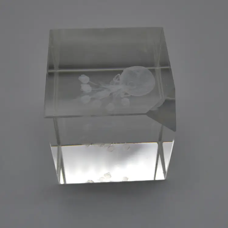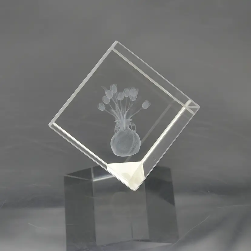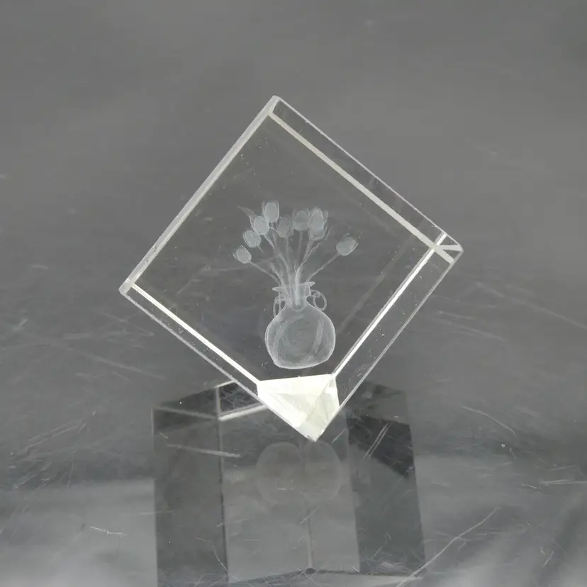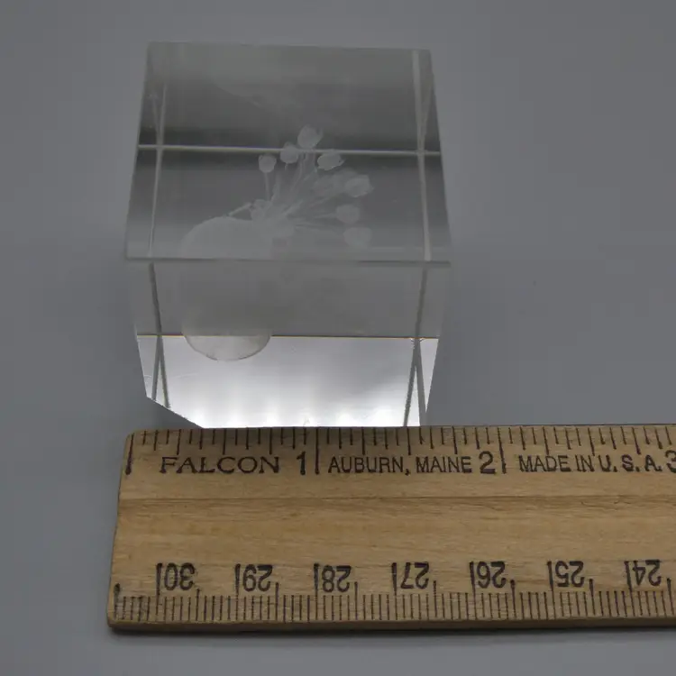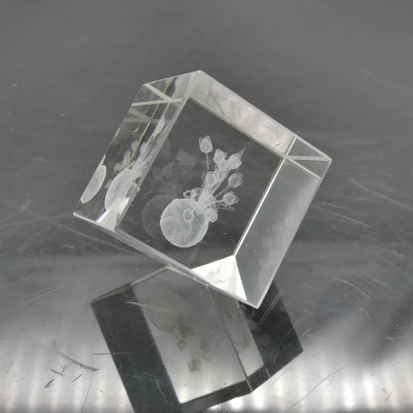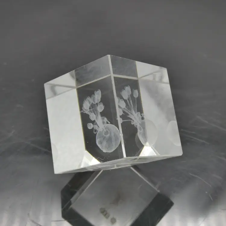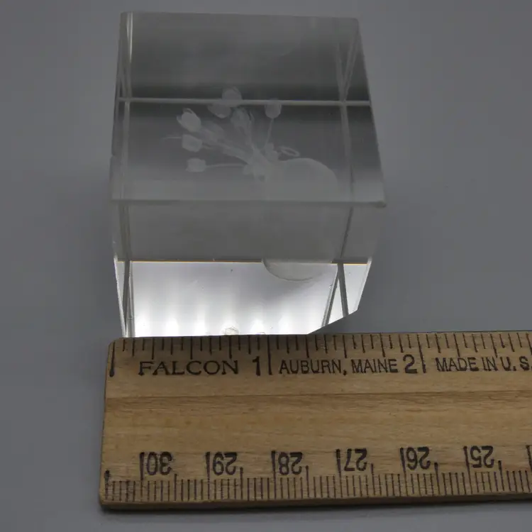 Featuring a bouquet of tulips in a rounded vase with loop handles Laser etched clear glass cube paperweight One corner is beveled for displaying at an angle. Can also be displayed sitting flat. Measures overall about 1-1/2" square Weighs about 5 ounces before being packaged to ship