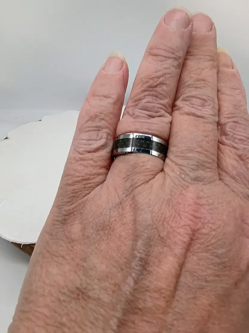 Tungston Carbide Unisex Fashion Ring Wedding Band 8MM Basket weave Inlay Size 8. This is preowned. No dents dings scuffs or scratches . This is not engraved other then makers mark. Inlaid center band is a basket weave pattern in browns and black look at last phot for true colors it just kept reflecting oddly and looks more gold. Excellent condition. Ships USPS