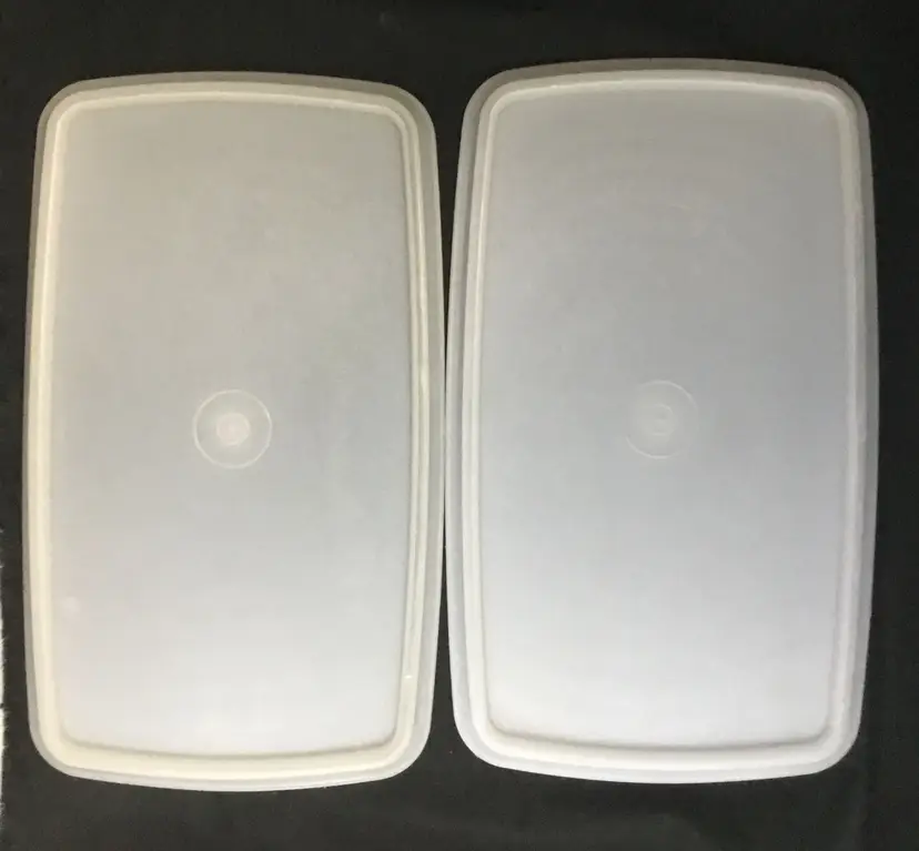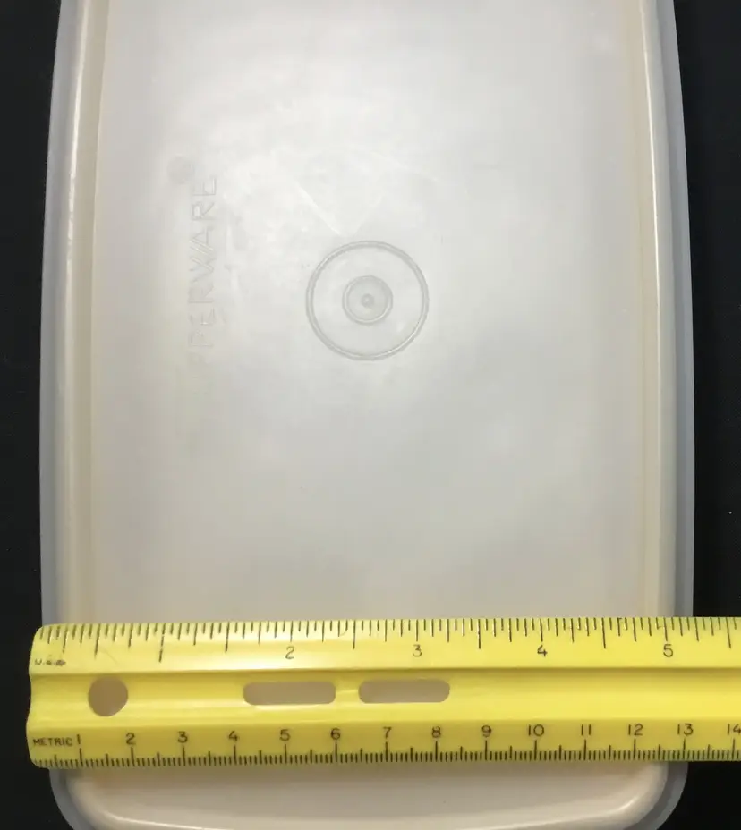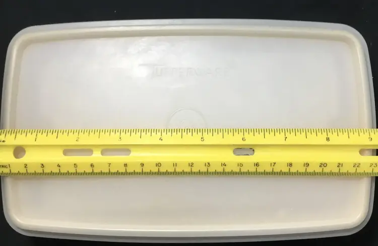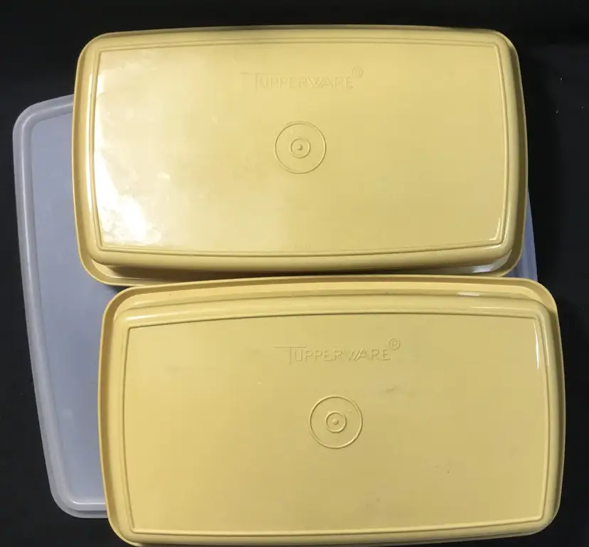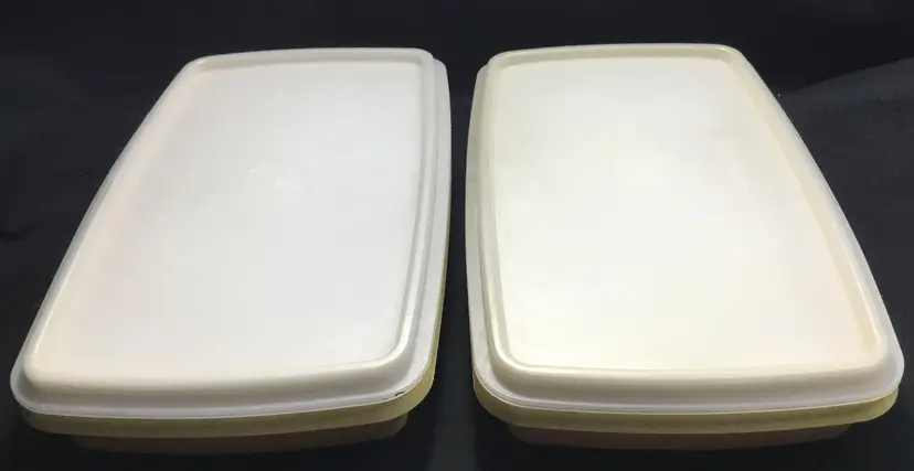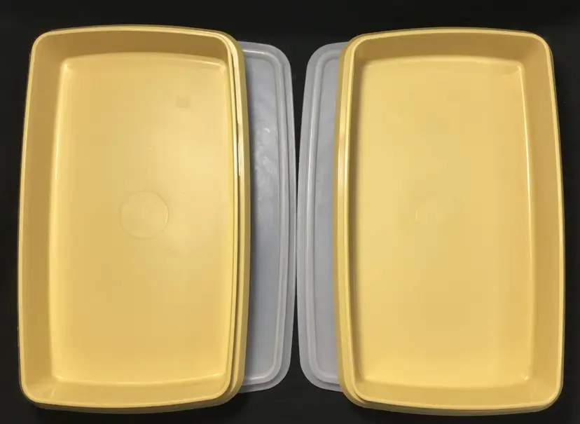 Set of 2, 9 inches long by 5 inches wide by 1.5 inches deep. Deviled egg keepers, with removable inserts and lids. Gold color with white inserts and white lids. Each container can be used for multiple kinds of storage with inserts removed. Very good condition, minor scrapes or small scratches on plastic, each container has small, pale stains on the bottom (See all photos.)