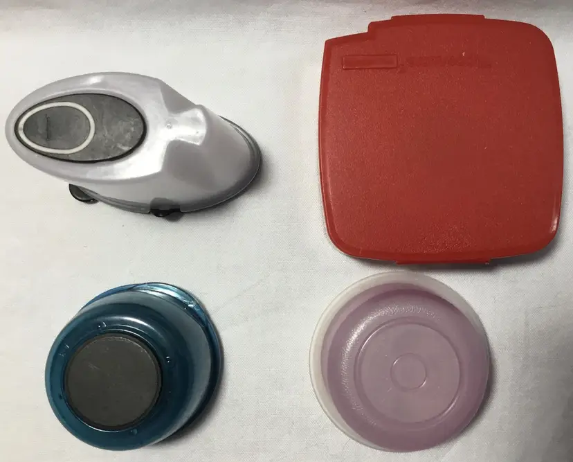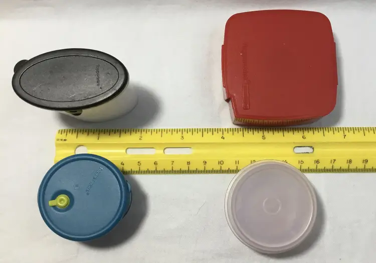 Vintage lot of 3 mini Tupperware items and 1 label dispenser. Mini version of "First in - first out" cereal keeper with lid. Mini version of "Vent-n-serve" blue bowl with lid is a fridge magnet. Mini, pink "Smidget" with lid, 1 ounce capacity. Red 3" x 3" label dispenser with To: From: Christmas labels.