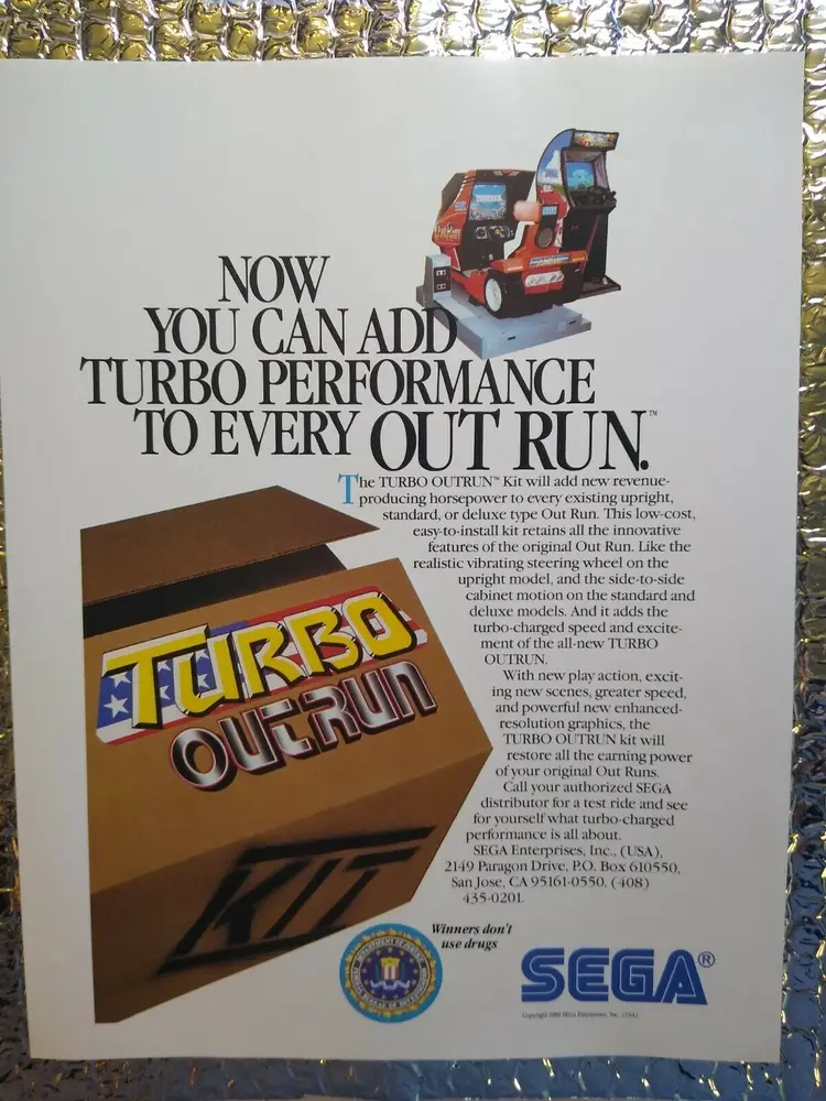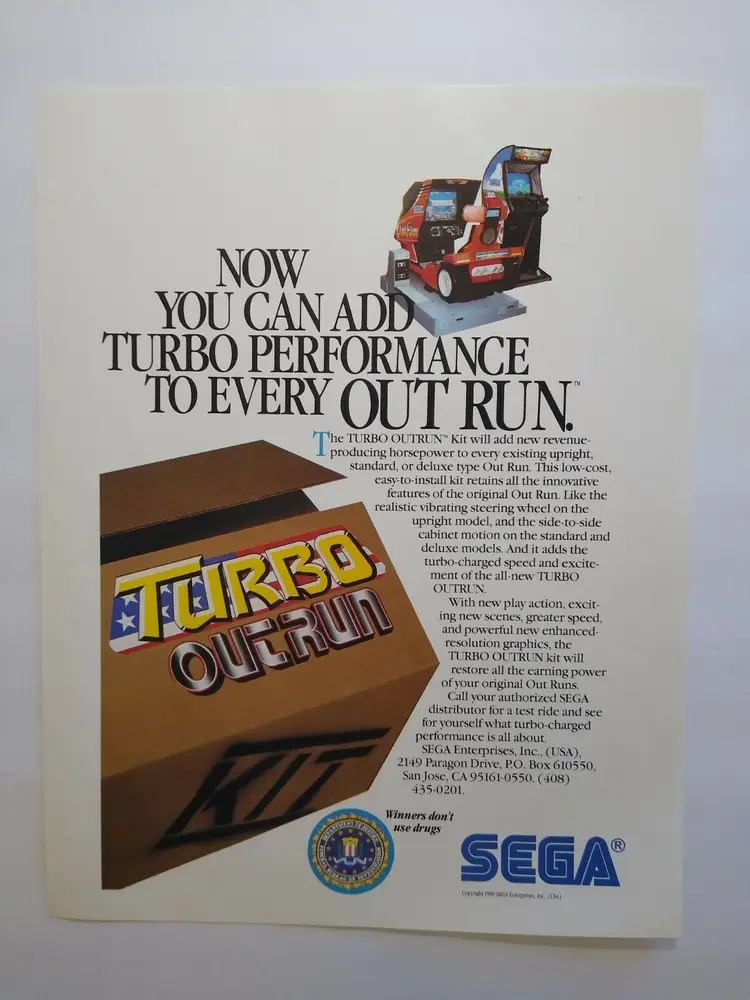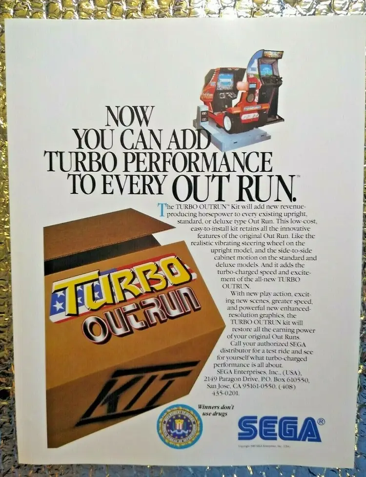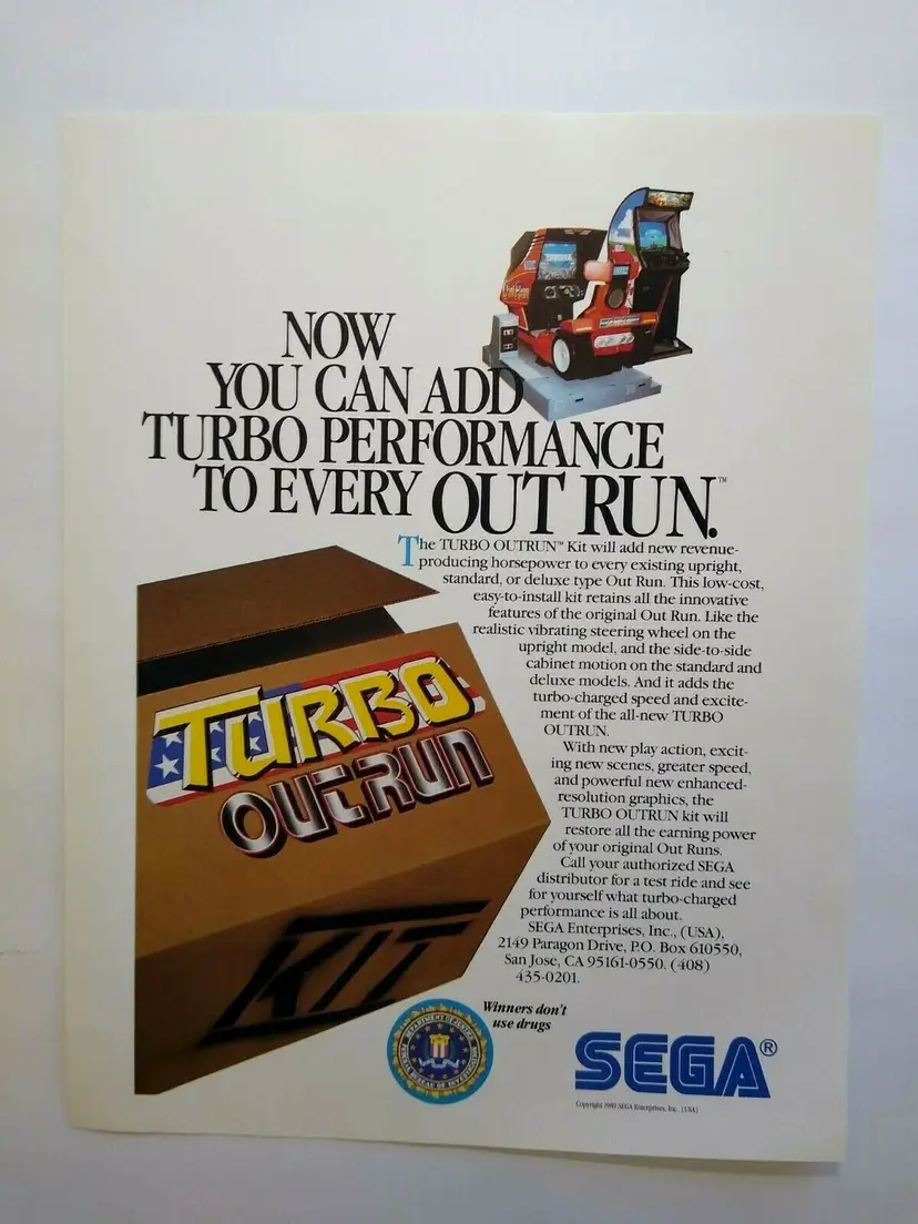 Arcade: Flyer Theme: Auto Racing Modified Item: No Country/Region of Manufacture: United States Original/Reproduction: Original Year: 1988 Game Title: Turbo Outrun Brand: SEGA