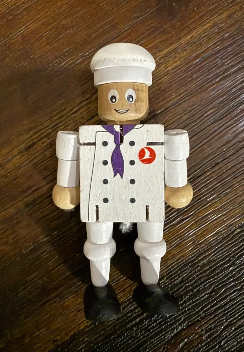 Bring a touch of Turkish Airlines hospitality into your home with this adorable wooden chef figure toy, dressed in classic white chef outfit, represents the iconic in-flight chefs of Turkish Airlines. It is in very good condition with very minimal signs of wear.