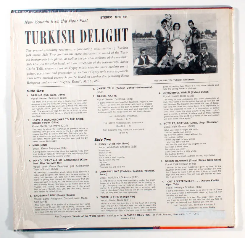 Turkish Delight (New Sounds From The Near East) on Monitor Records is a vibrant collection showcasing Turkish folk music, featuring ensembles like The Urosevich Ensemble, The Stevo Teodosievski Ensemble, and The Dolgru Yol Turkish Ensemble. Side one highlights Turkish Gypsy music with modern instruments like guitar, accordion, and percussion, while side two emphasizes traditional Turkish instruments and vocal melisma, offering a rich cross-section of the region's musical heritage. Released during a period of cultural openness in Turkey following the Tanzimat reforms and Atatürk’s musical modernization efforts, the album reflects the blending of traditional Anatolian sounds with Western influences, a hallmark of the era’s Anatolian rock movement. No specific hit singles from this album are documented in the provided references, suggesting its significance lies more in its cultural representation than chart success. The album remains a collectible LP, valued for its near-unplayed vinyl quality and its role in preserving and presenting Turkish musical traditions to a global audience.