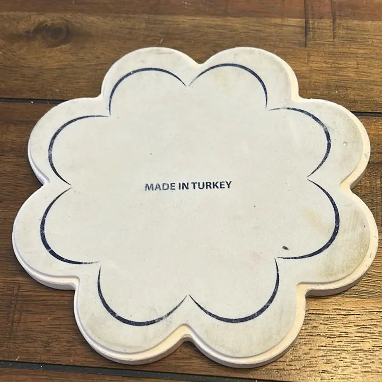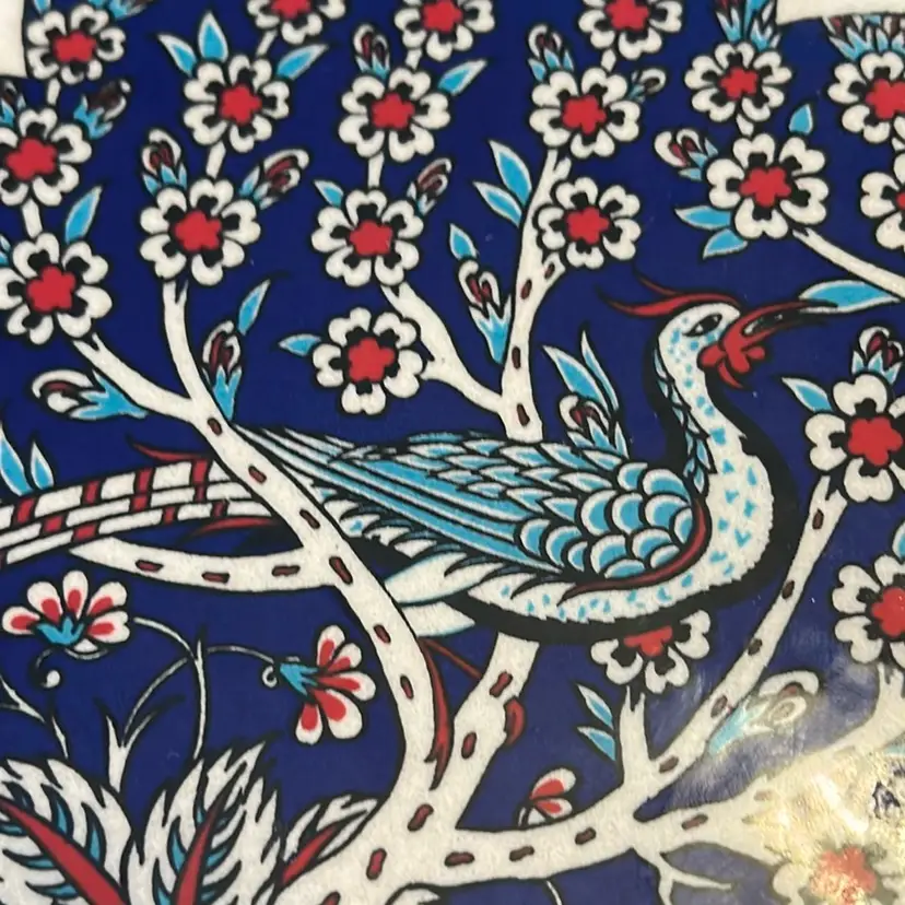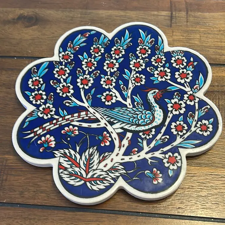 This Turkish trivet has a bird and tree. It is about 7” wide.