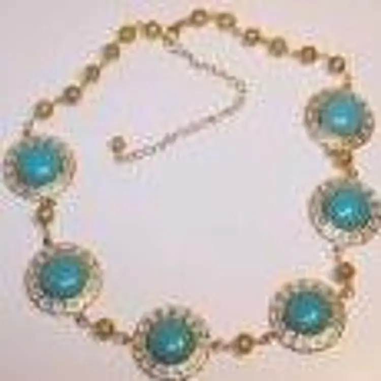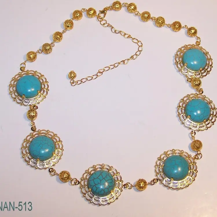 NMLot17 - NAN513 – Six 1 3/16 inch gold plated stamped filigree open backed cabochon settings hold 11 1/6 inch Turquoise cabochon stone in each setting and has been linked with ¼ inch gold plated filigree beads between each setting. Same gold plated beads have been linked together along with these settings to make this necklace. Necklace length can be adjusted between 19 inches to 24 inches.