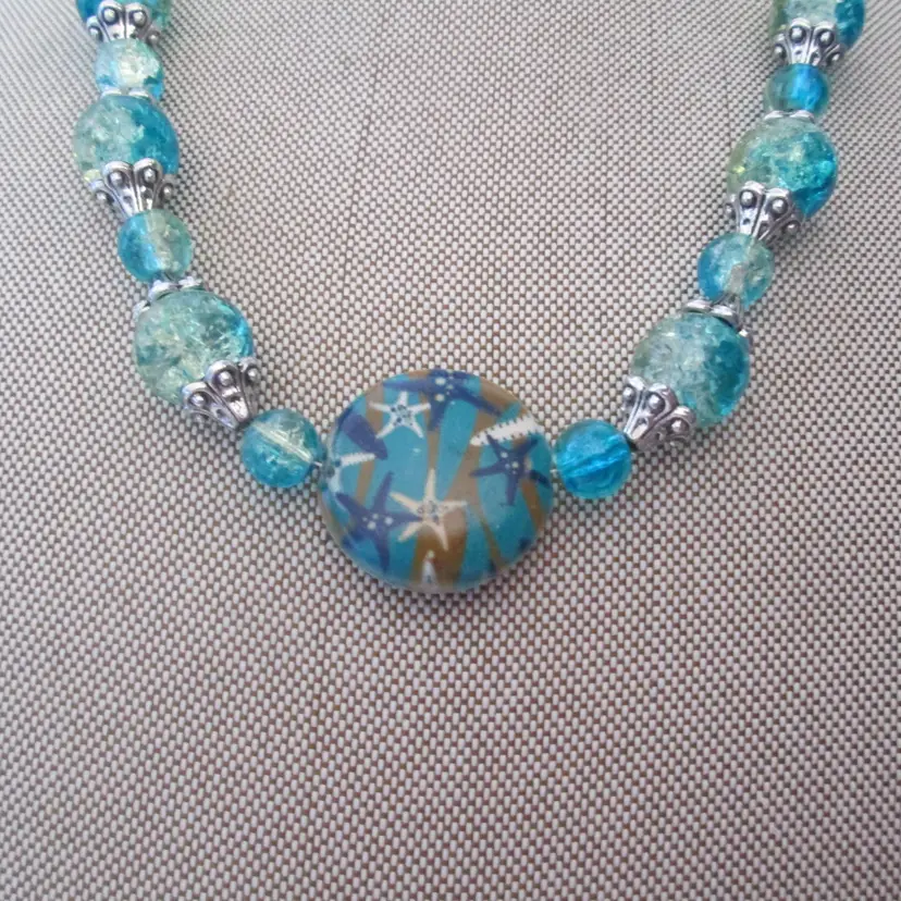 Turquoise blue and green crackle glass beaded necklace with ceramic starfish bead. Length is 17" to 18" with adjustment. Created with vintage beads.