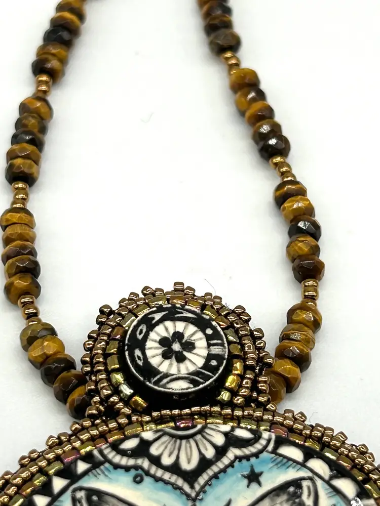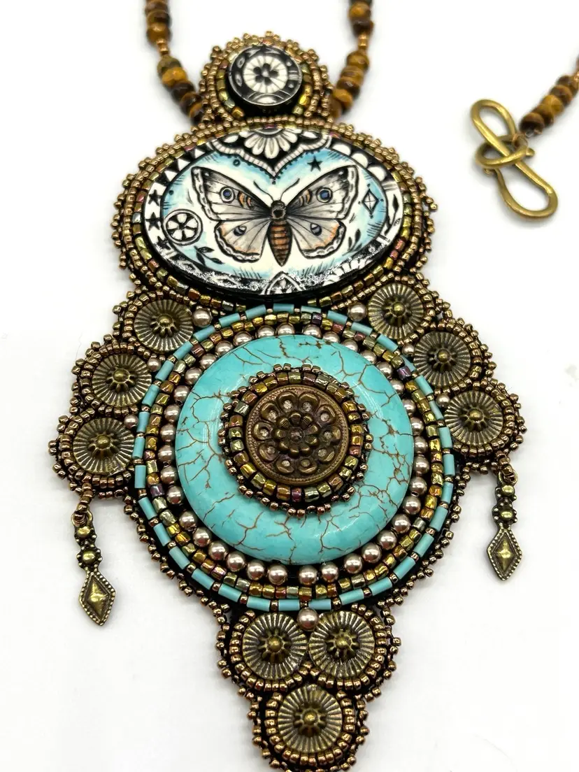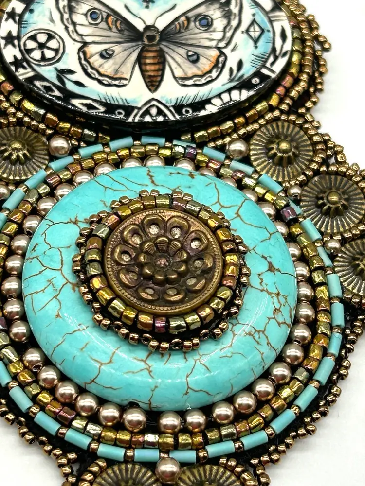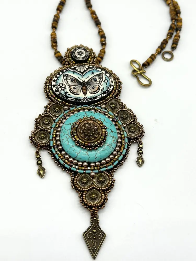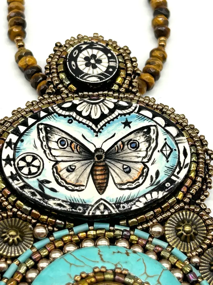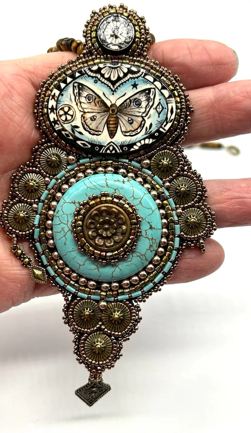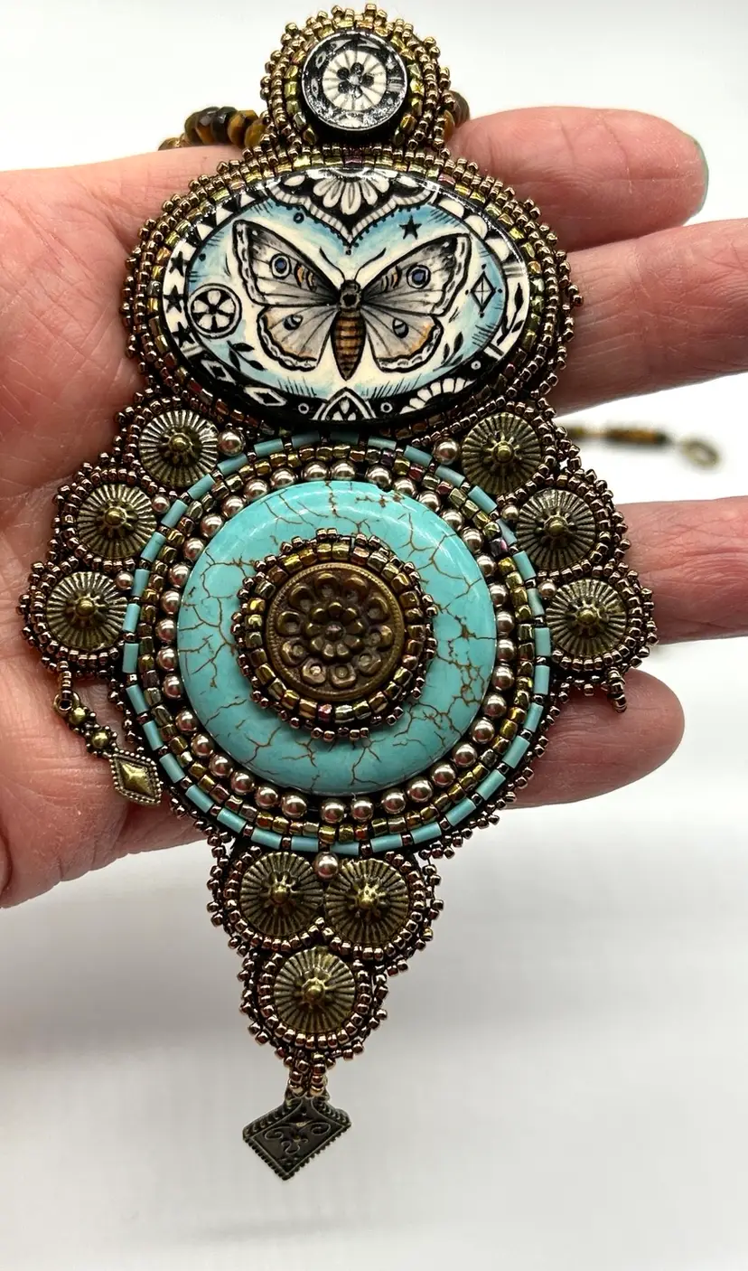 Gorgeous hand bead embroidered necklace made by me in my Seattle studio. This piece offers a hand painted moth porcelain cab by Jean of Folkloric Design.