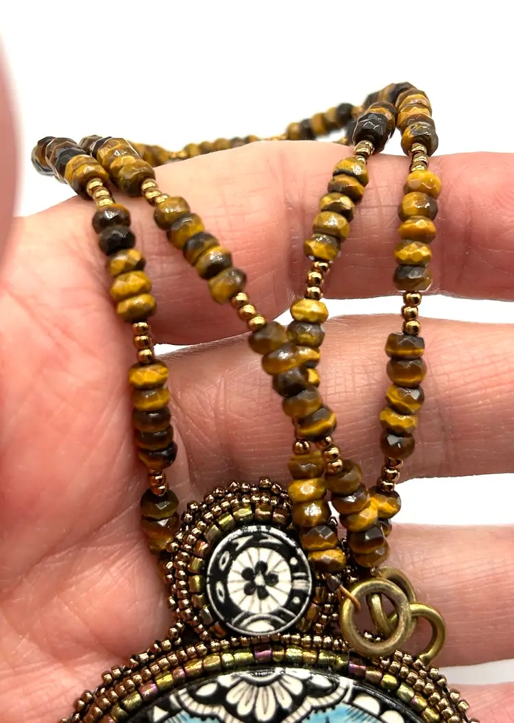 Centered is a turquoise doughnut bead with an antique button. The necklace features rondelle shaped natural tiger eye beads.
