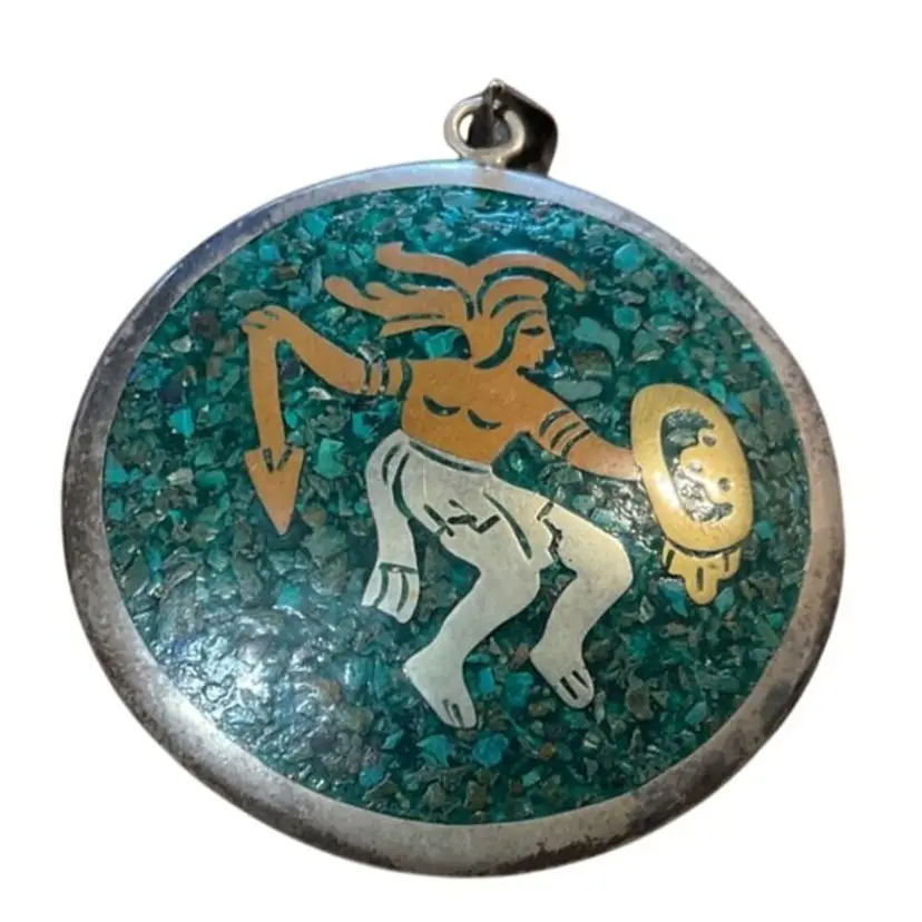 A striking Turquoise Taxco Mexican warrior pendant featuring intricate silver, copper, and brass inlay. This unique piece showcases fine craftsmanship, perfect for any jewelry collection.