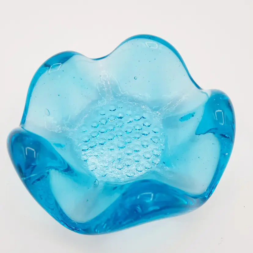 This sweet trinket dish measures 3 1/4"W x 1 1/4"H, does have bubbles in glass, great condition!