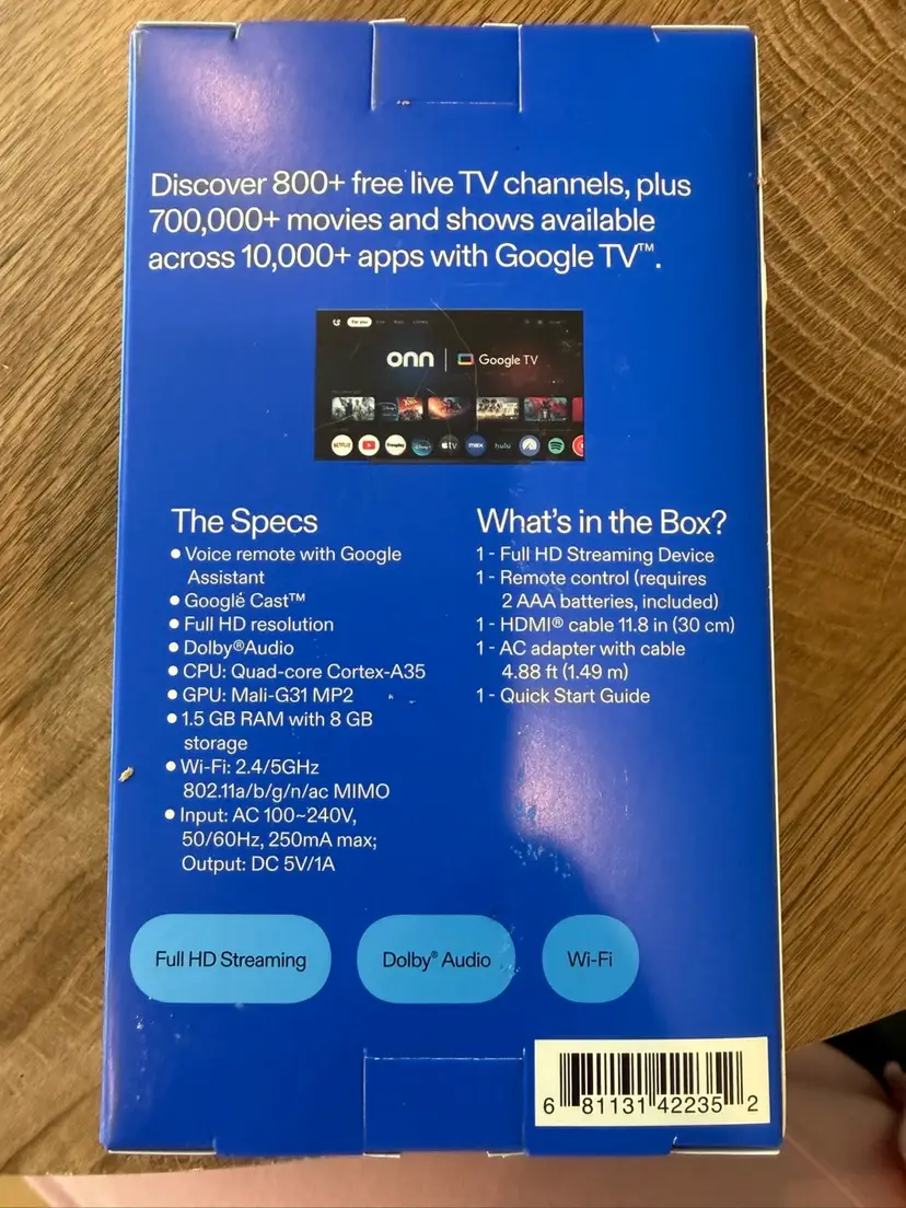 The onn Google TV Full HD Streaming Device offers an extensive entertainment experience, allowing you to discover over 800 free live TV channels and access more than 700,000 movies and shows across 10,000+ apps with Google TV. It comes with a voice remote featuring Google Assistant for easy navigation and control. The device supports Google Cast, enabling you to cast content from your phone or tablet directly to your TV. With full HD resolution and Dolby audio, you can enjoy high-quality video and sound. Powered by a Quad-core Cortex-A35 CPU and Mali-G31 MP2 GPU, it provides smooth performance, complemented by 1.5 GB RAM and 8 GB of storage. The device supports dual-band Wi-Fi (2.4/5GHz 802.11a/b/g/n/ac MIMO) for reliable connectivity. It operates with an input of AC 100-240V, 50/60Hz, 250mA max, and outputs DC 5V/1A. Stay connected with the onn Google TV Full HD Streaming Device.