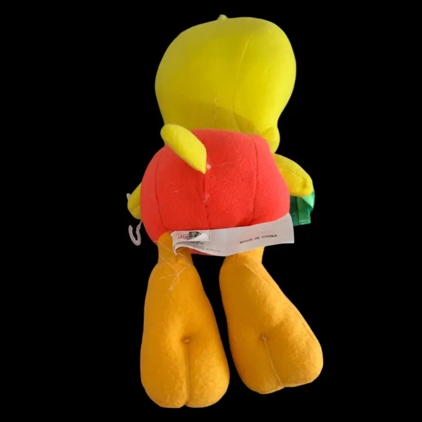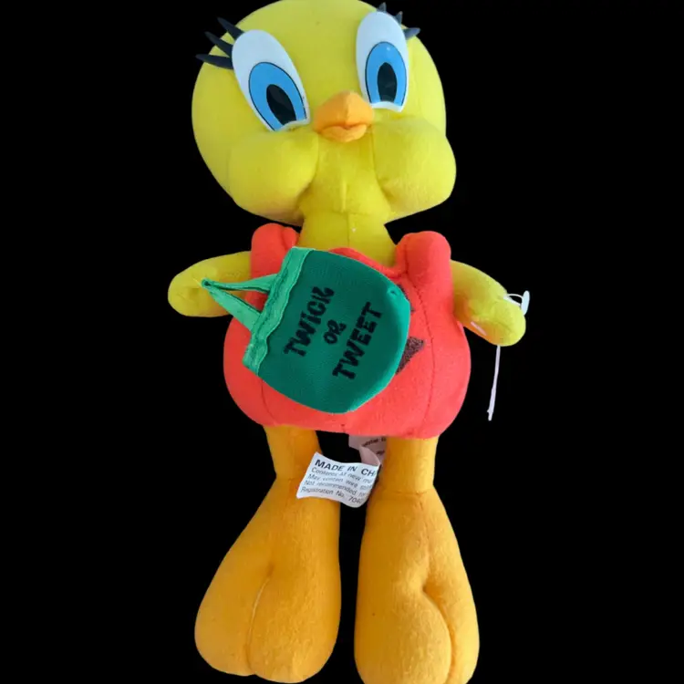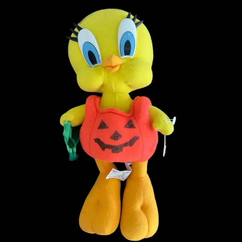 This item is a vintage 1997 Looney Tunes Tweety Bird plush dressed in a Halloween pumpkin costume. Tweety measures approximately 10 inches tall.