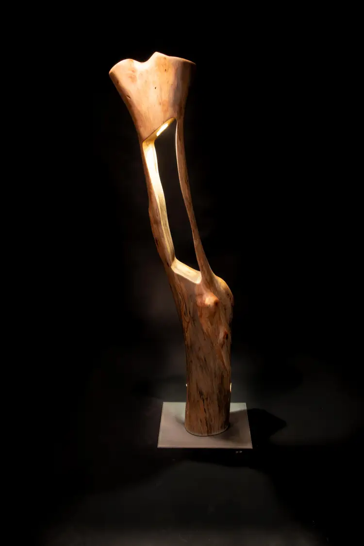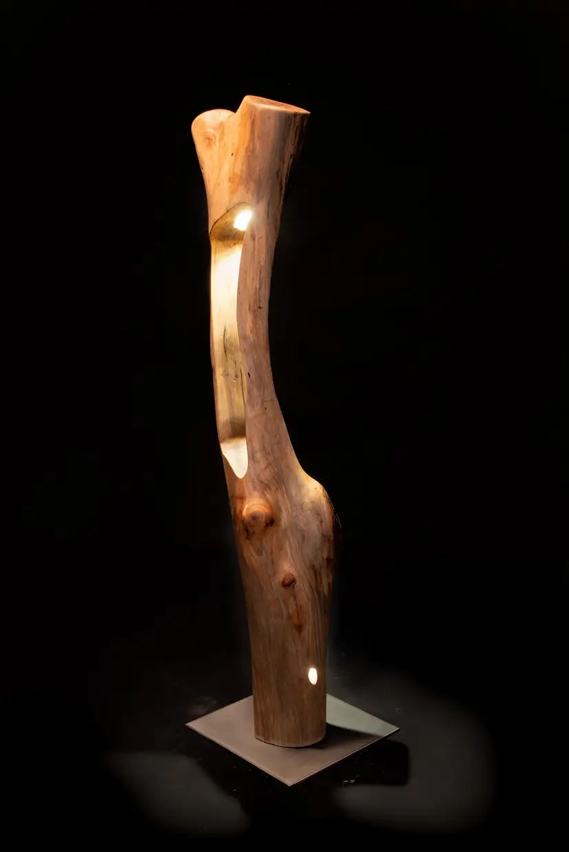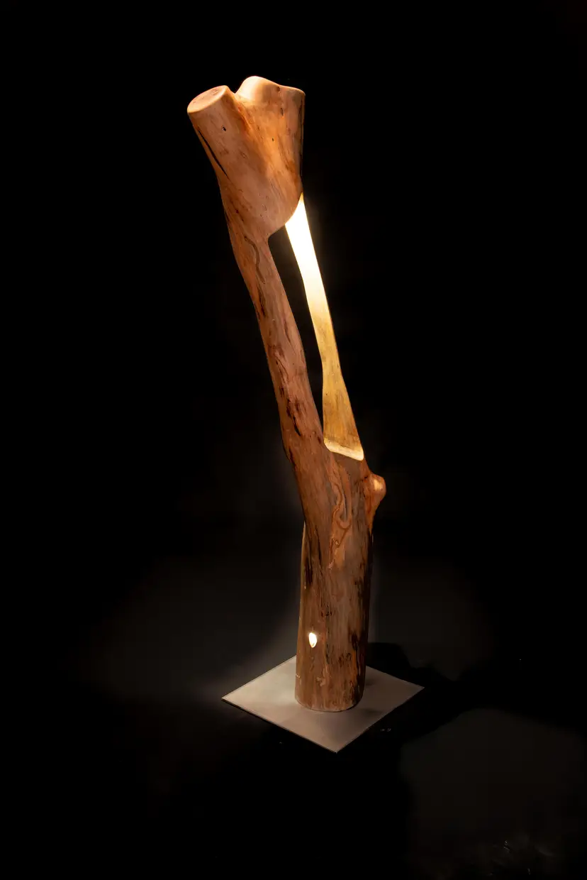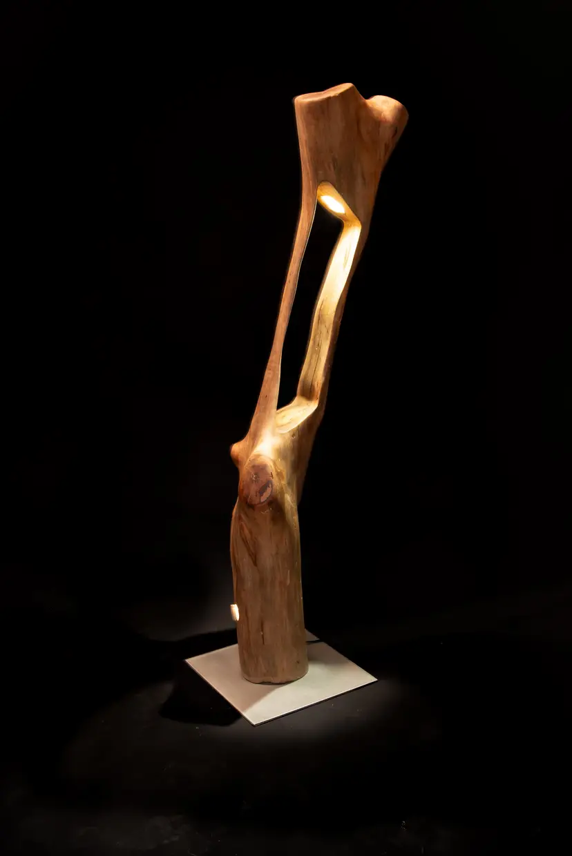 Each piece begins as a single log or cross-section—often reclaimed locally—and is transformed through a slow, hands-on process of carving, burning, and refinement. Light is then integrated into the form, revealing hidden structures, depth, and movement within the wood itself.