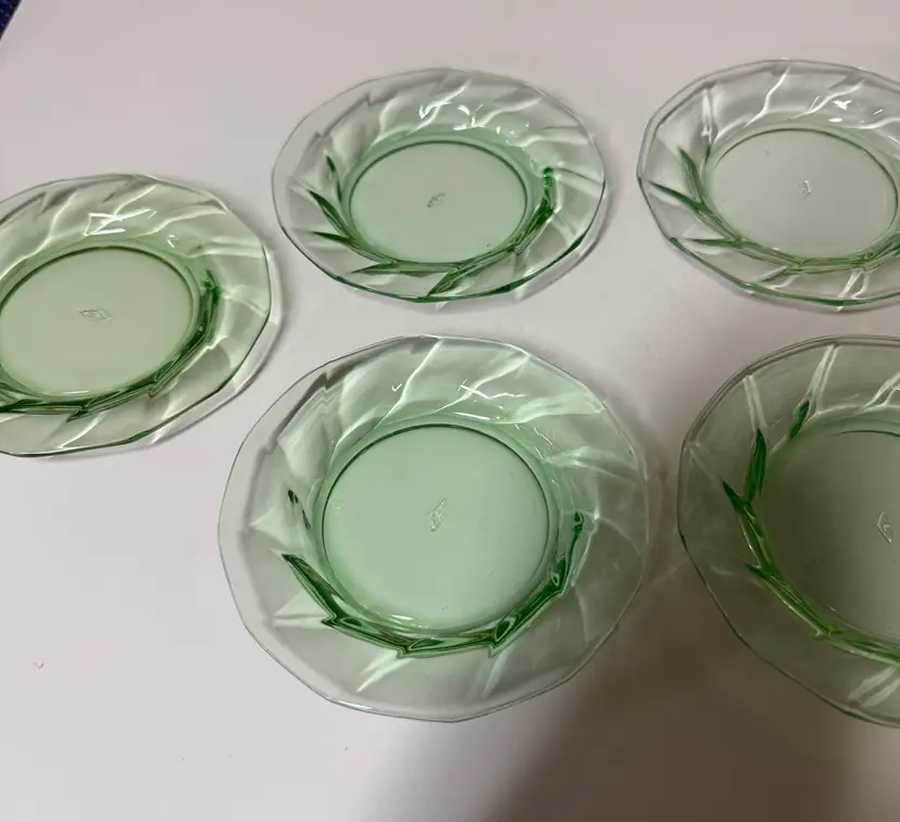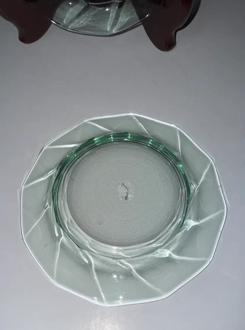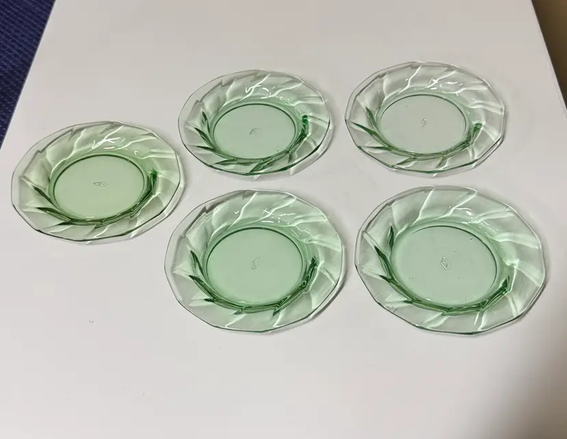 Elegant green glass plates with a wavy design. Perfect for dining or display. Twist Green (Moongleam) by HEISEY 4 3/8” diameter Pressed Glass Crafted In United States Discontinued Piece Excellent like new condition with no breaks or chips (1377121243)