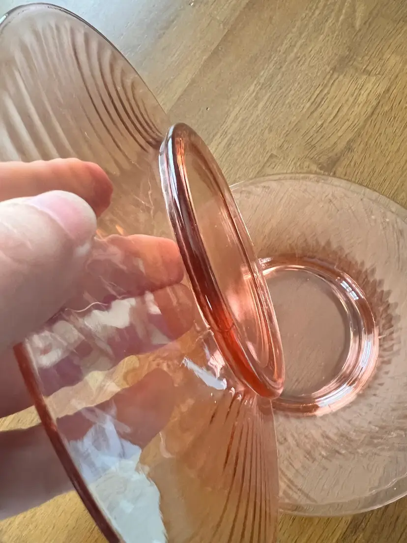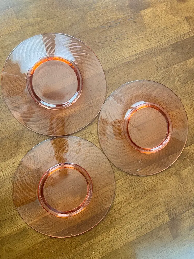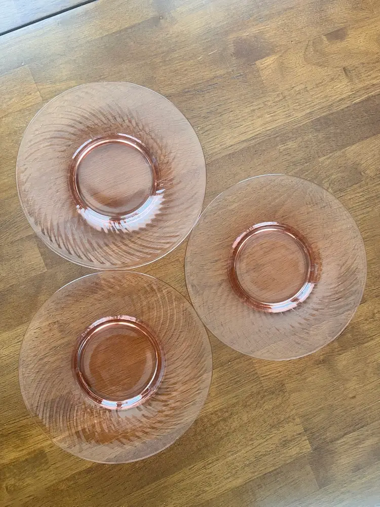 Twisted Optic Pink Imperial Glass Plates (3). This set of three 8” footed plates are in vintage condition. They would be a pretty add on to a mismatched set or used as a base for candles or small plants. Also a great way to gift candies for Valentine’s Day.
