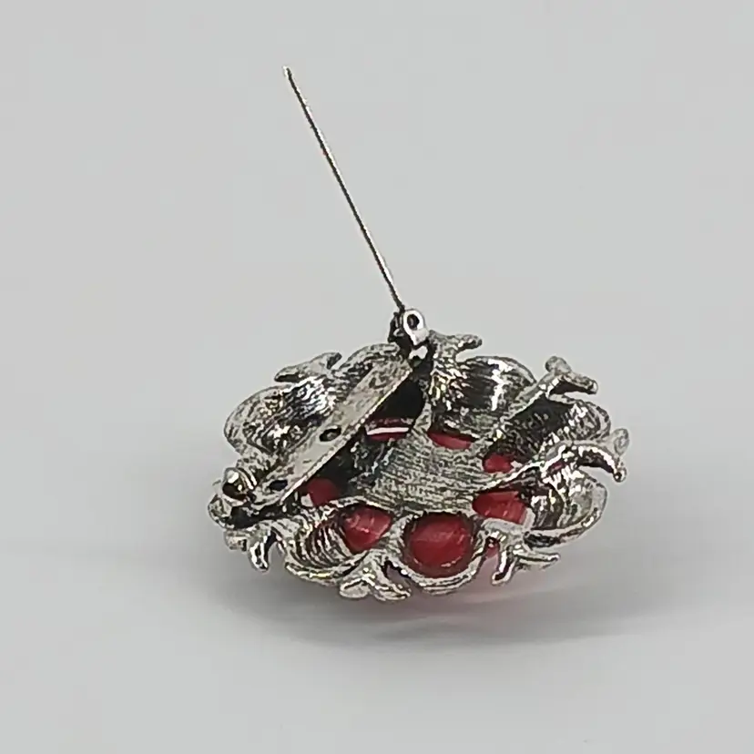 Qty 2 - PM-75 – A 25mm x 18mm Argentina Rhodochrosite gemstone cabochon has been mounted into a 1 13/16" x 1 9/16" antique silver plated brooch setting. This will be the last time I list these brooches.