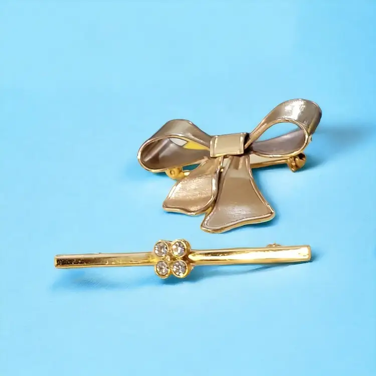 Avon still has a great following. These two brooches/pins are fun alone or together or with scatter pins. Tie the bow on to a special holiday package! Or keep it for your Avon collection. The bow is marked Avon 1980 and the bar pin is marked Avon. The bar pin has four tiny acrylic rhinestones. Both are in great shape!