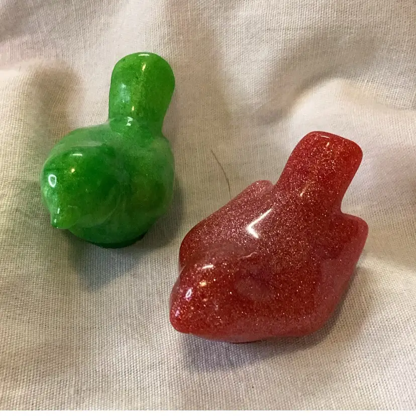 Went green and one red bird. They are one and a half inches long and a half inch tall and an inch wide. They are made of resin.