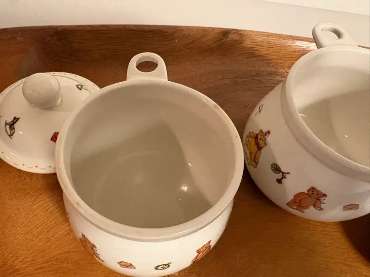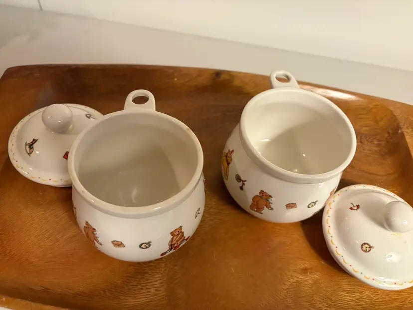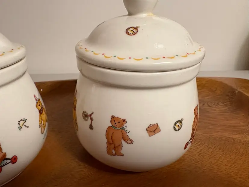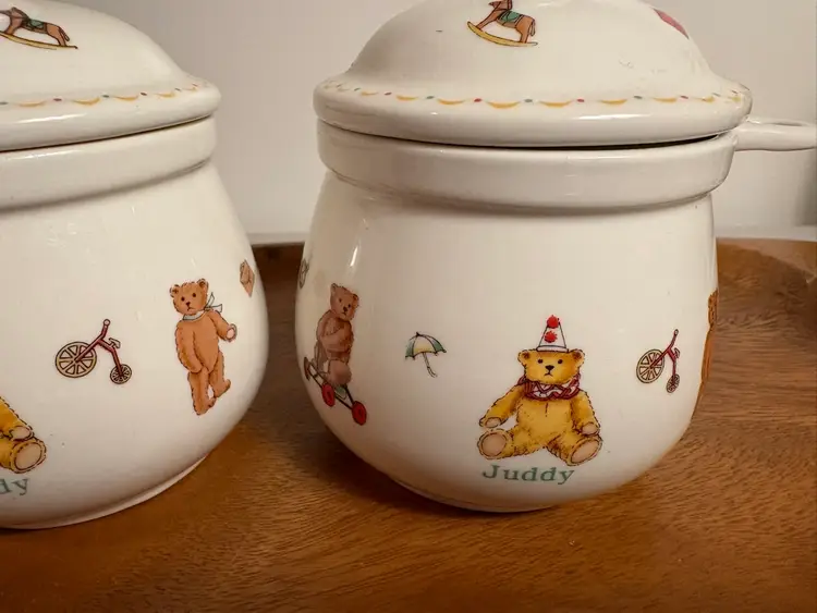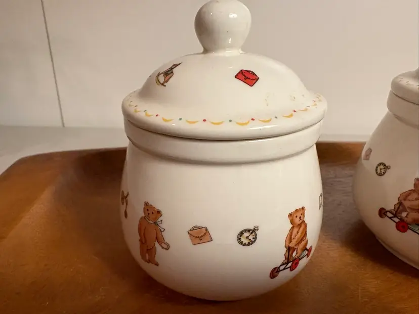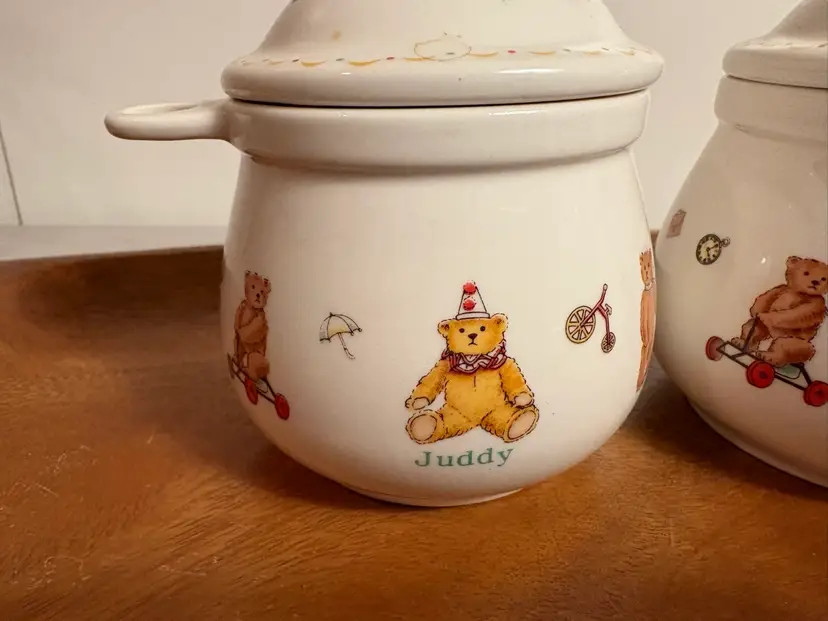 The Two Chulkiart Juddy Teddy Bear Lidded Containers are a set of decorative jars featuring a cute teddy bear pattern. Made from ceramic with a glossy finish, these containers originate from England. Perfect for storing food or small trinkets or decorations, these Chulkiart Juddy Teddy Bear containers add a charming touch to any space with their adorable design. Ideal for collectors or those looking to enhance their homes with whimsical decor.