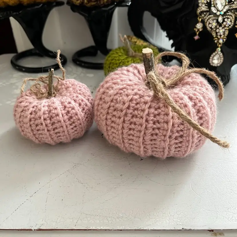 One small crocheted pink pumpkin and one medium pink crocheted pumpkin.