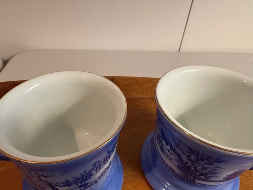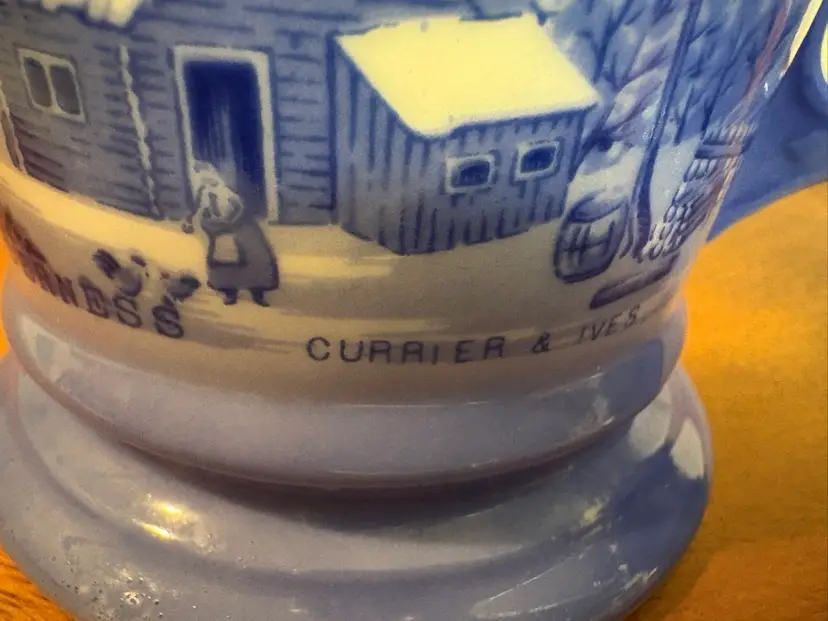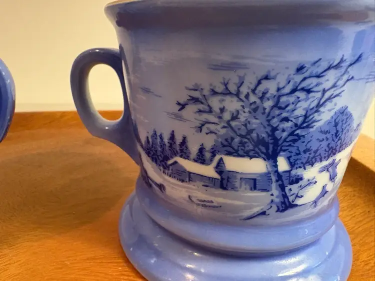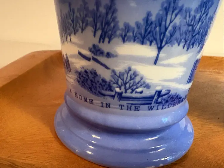 Vintage Currier and Ives mugs. One is Home in the Wilderness and the other is The Homestead in Winter. Bring vintage charm to your holiday mornings with this beautiful set of two large Currier & Ives ceramic mugs. Featuring classic blue and white pastoral winter scenes.