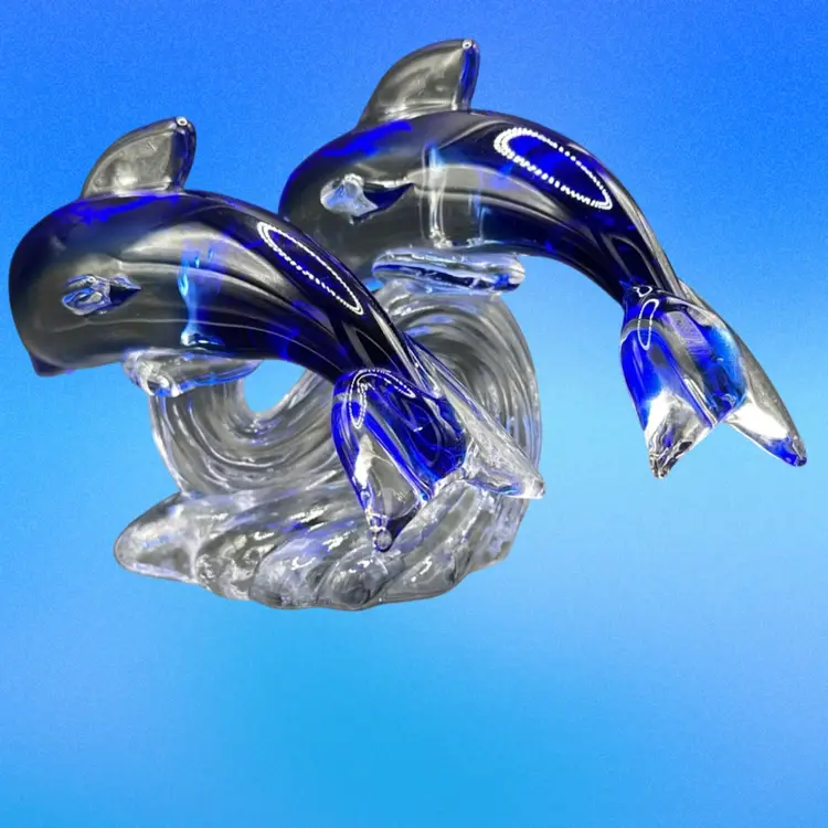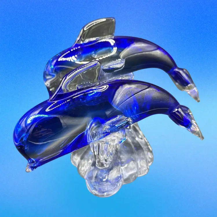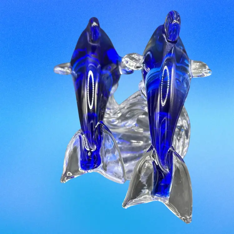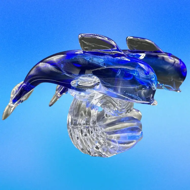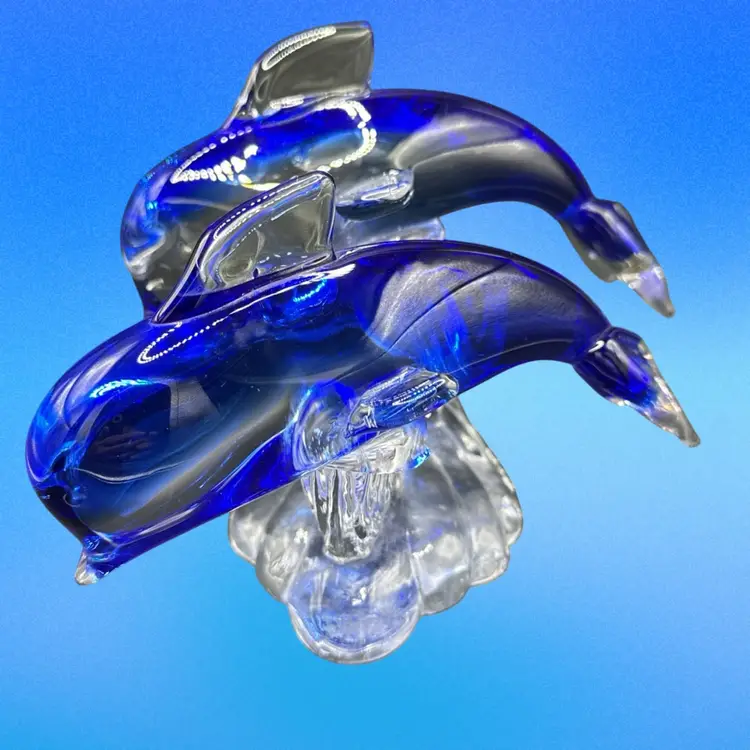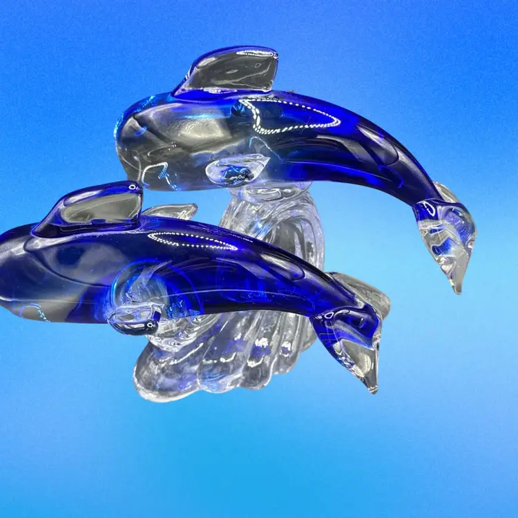 This product is a beautifully crafted art glass figurine featuring two dolphins surfing on a wave. The vibrant cobalt and clear colors add a touch of elegance to any space. This glass collectible piece is sure to be a stunning addition to any dolphin or marine animal enthusiast's collection.