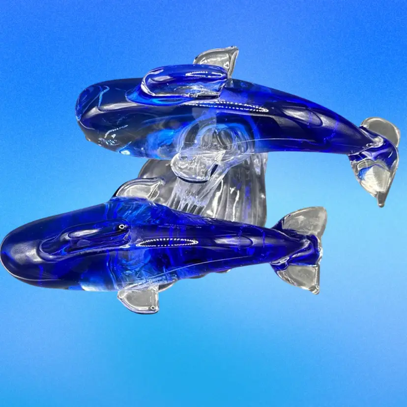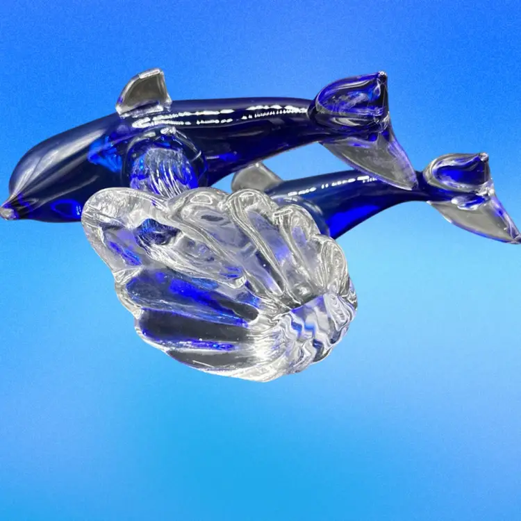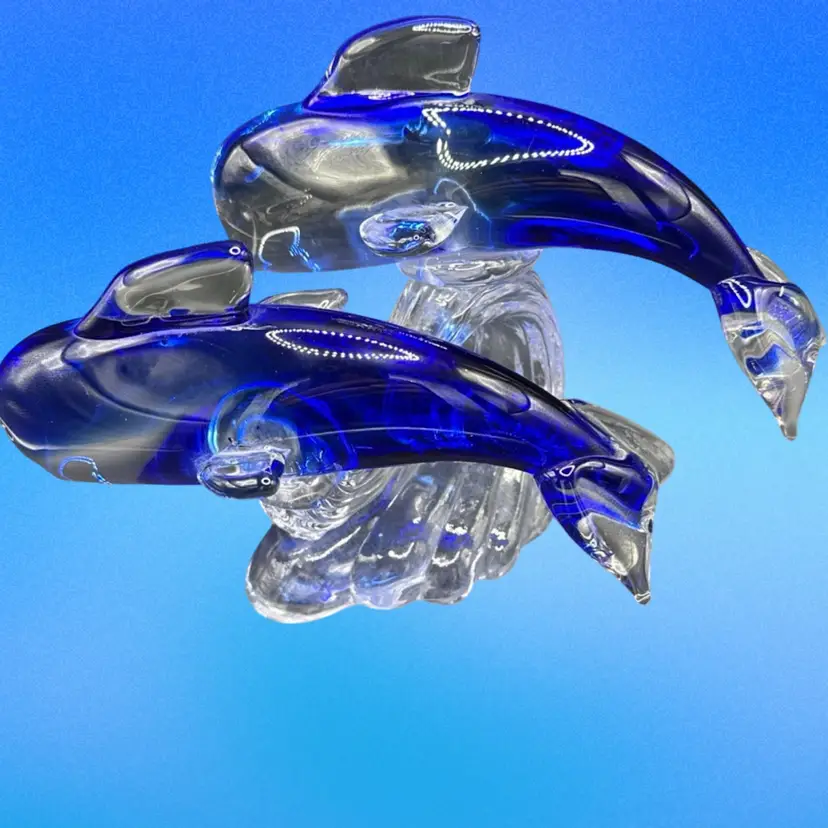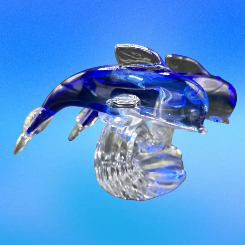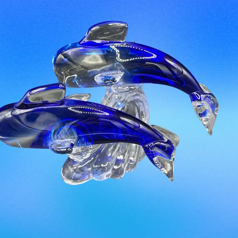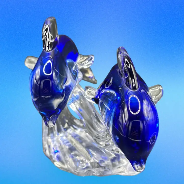 This product is a beautifully crafted art glass figurine featuring two dolphins surfing on a wave. The vibrant cobalt and clear colors add a touch of elegance to any space. This glass collectible piece is sure to be a stunning addition to any dolphin or marine animal enthusiast's collection.