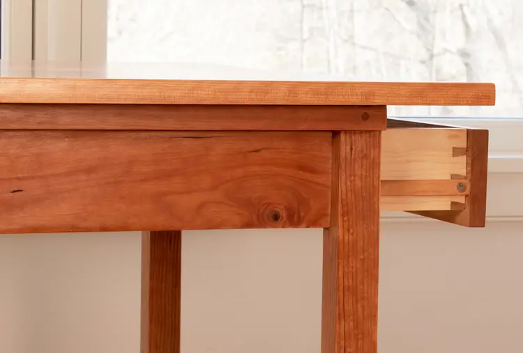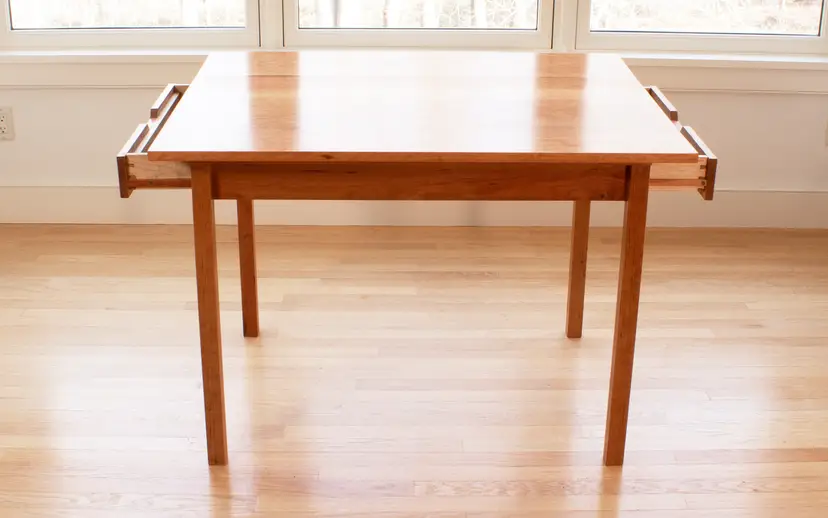 This simple and graceful table is perfect for a kitchen or as a side table in a living room or den. It features either two full width drawers which run the entire length of the table and slide on hardwood runners. It is finished 4 coats of hand rubbed varnish and two coats of paste wax.
